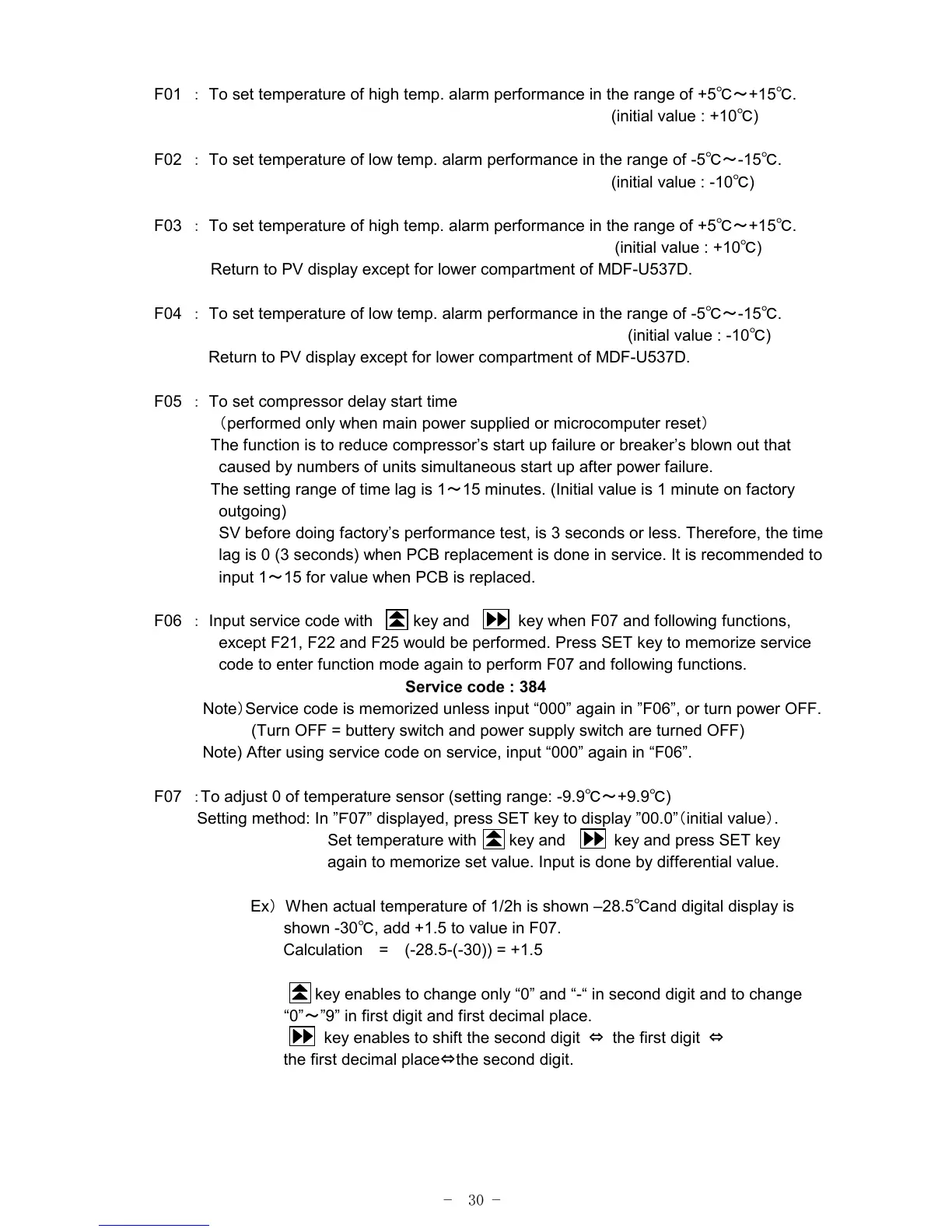 F01 : To set temperature of high temp. alarm performance in the range of +5℃~+15℃.