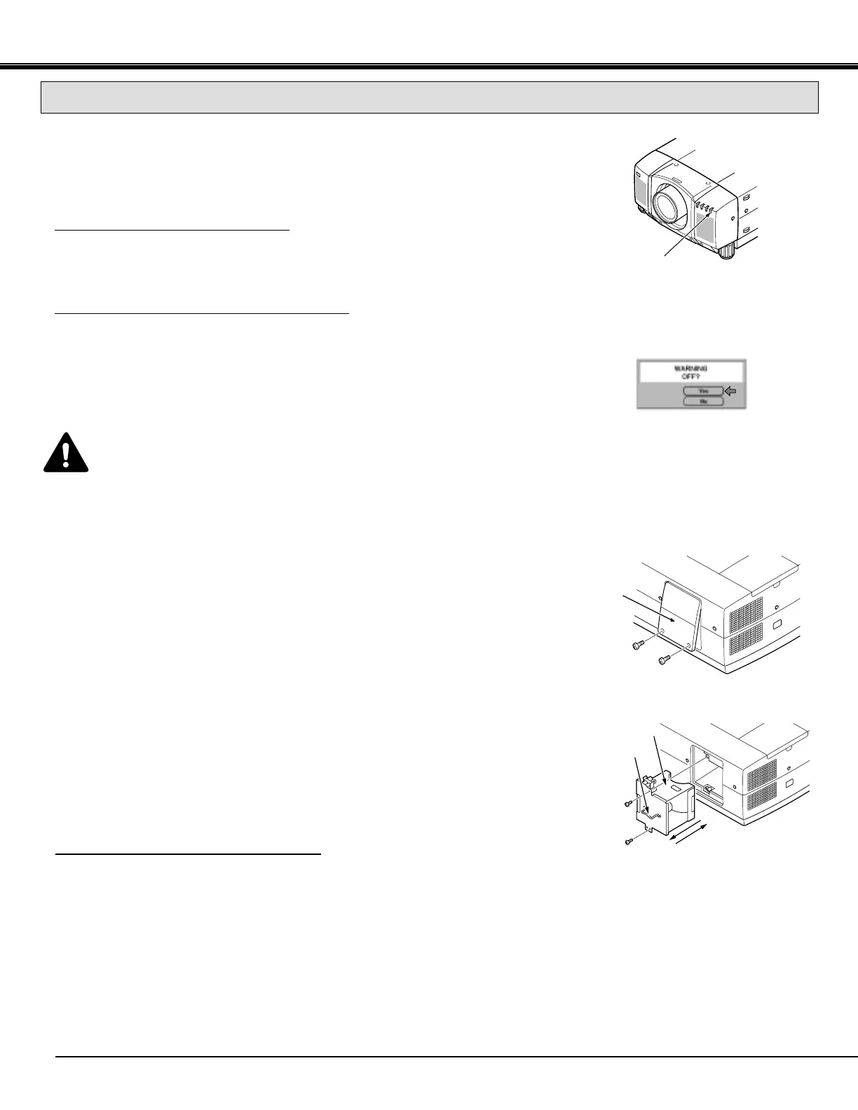 ● Allow the projector to cool for at least 45 minutes before you open the lamp cover. The inside of the