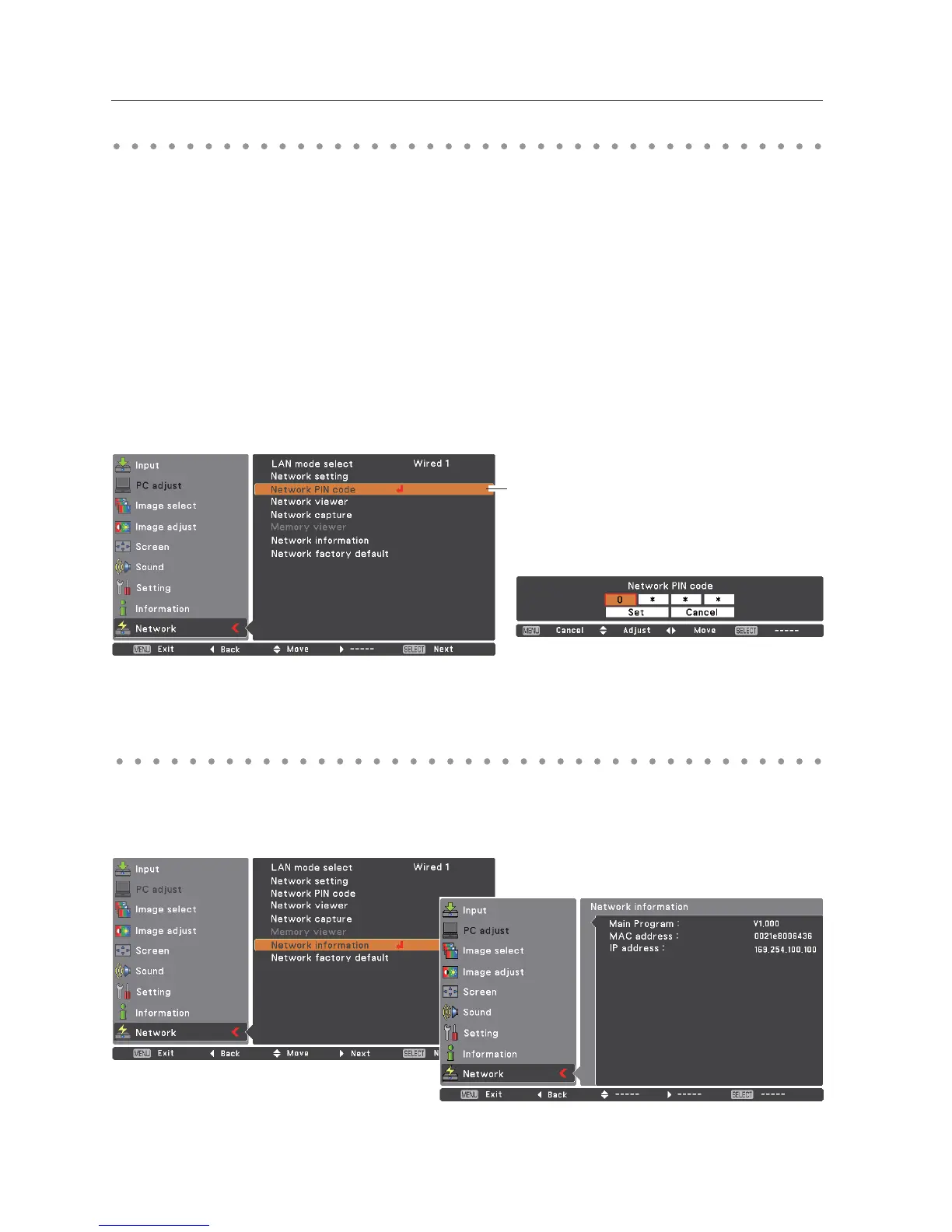 Select "Network information" in the Network menu and press Point or SELECT button to show LAN