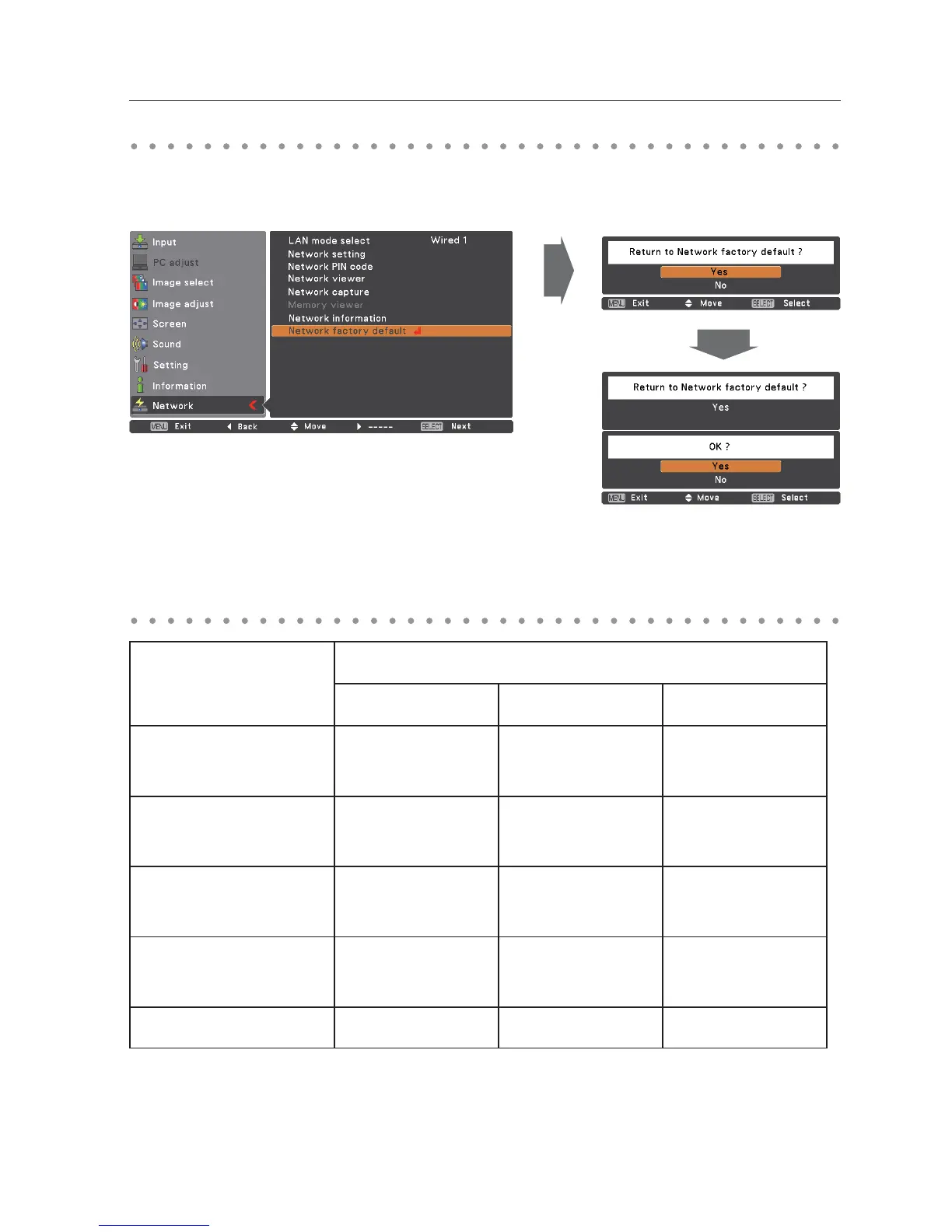 Select “Wired factory default” in the Network menu and press SELECT button. All the wired LAN settings