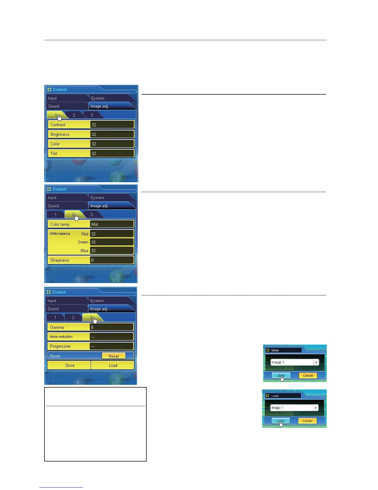 This function is to adjust the projected picture image and save the image mode. To store the adjusted