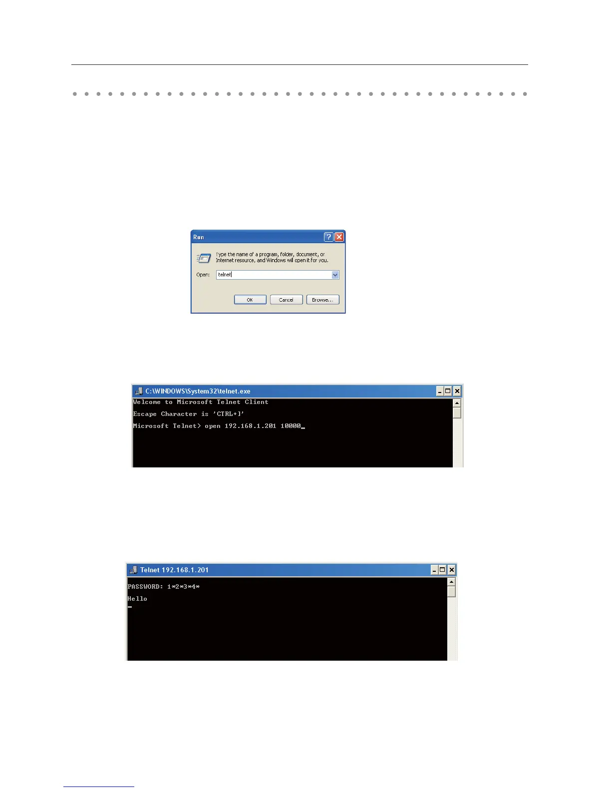 2. The telnet application will start and the following window will be displayed. Type as below to