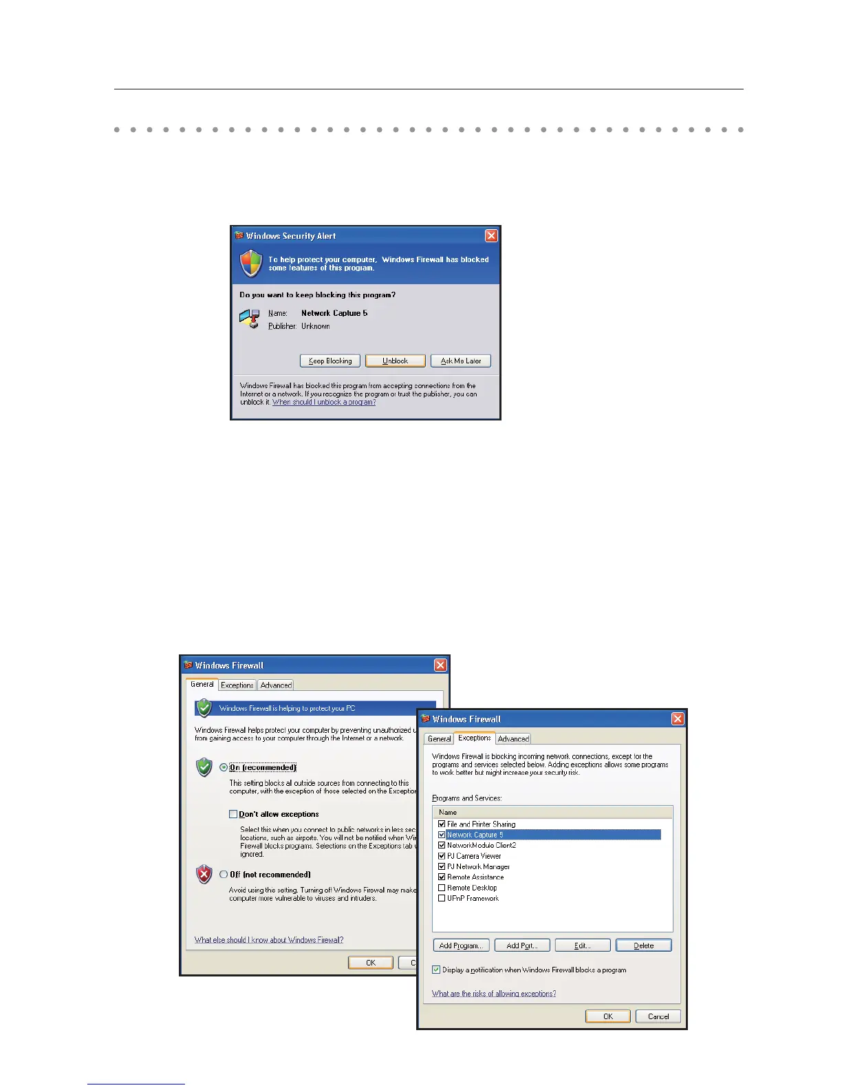 3 Select Exceptions tab and check the name of Network Capture 5 listed on the Programs and