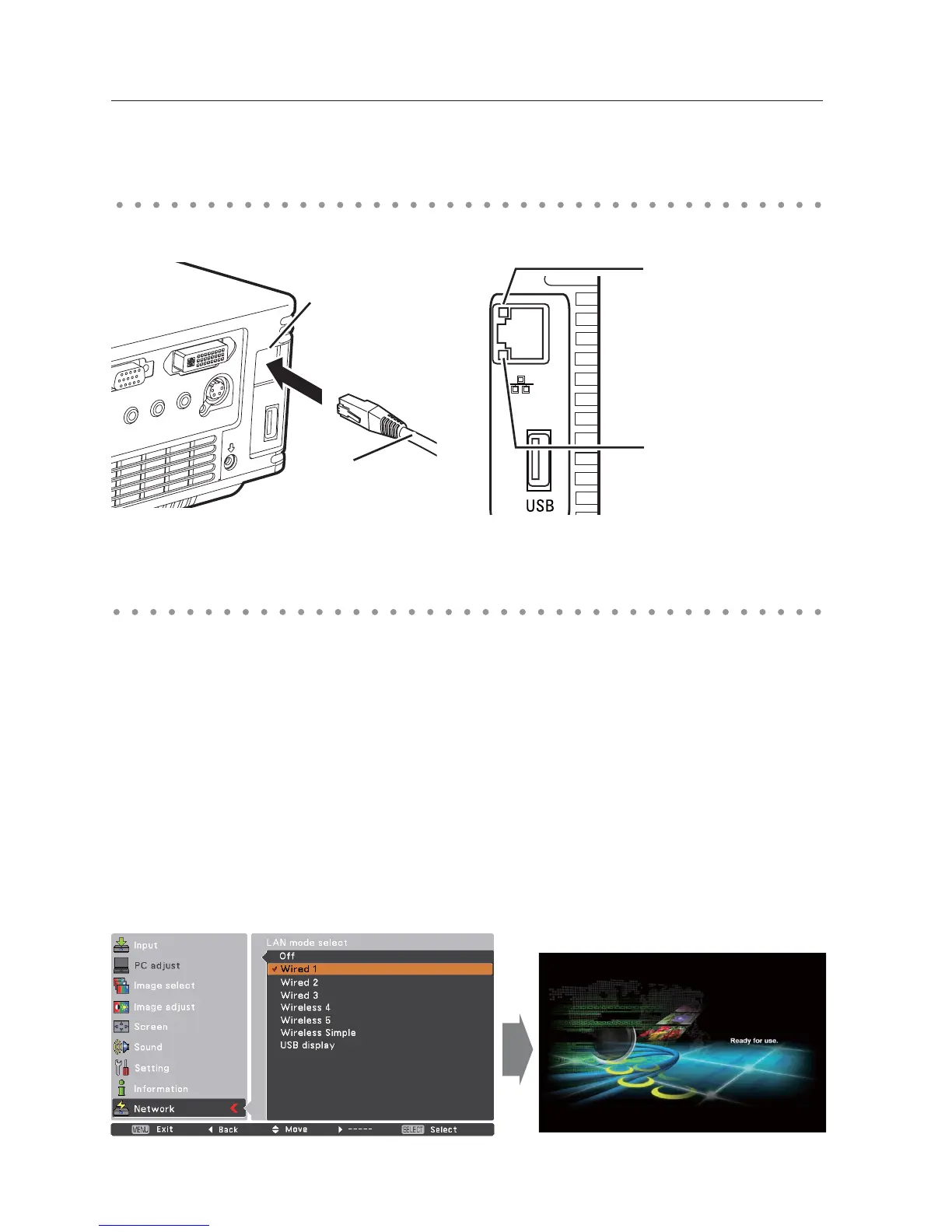 Set the Wired LAN network through the projector menu. Detailed network settings will be made with