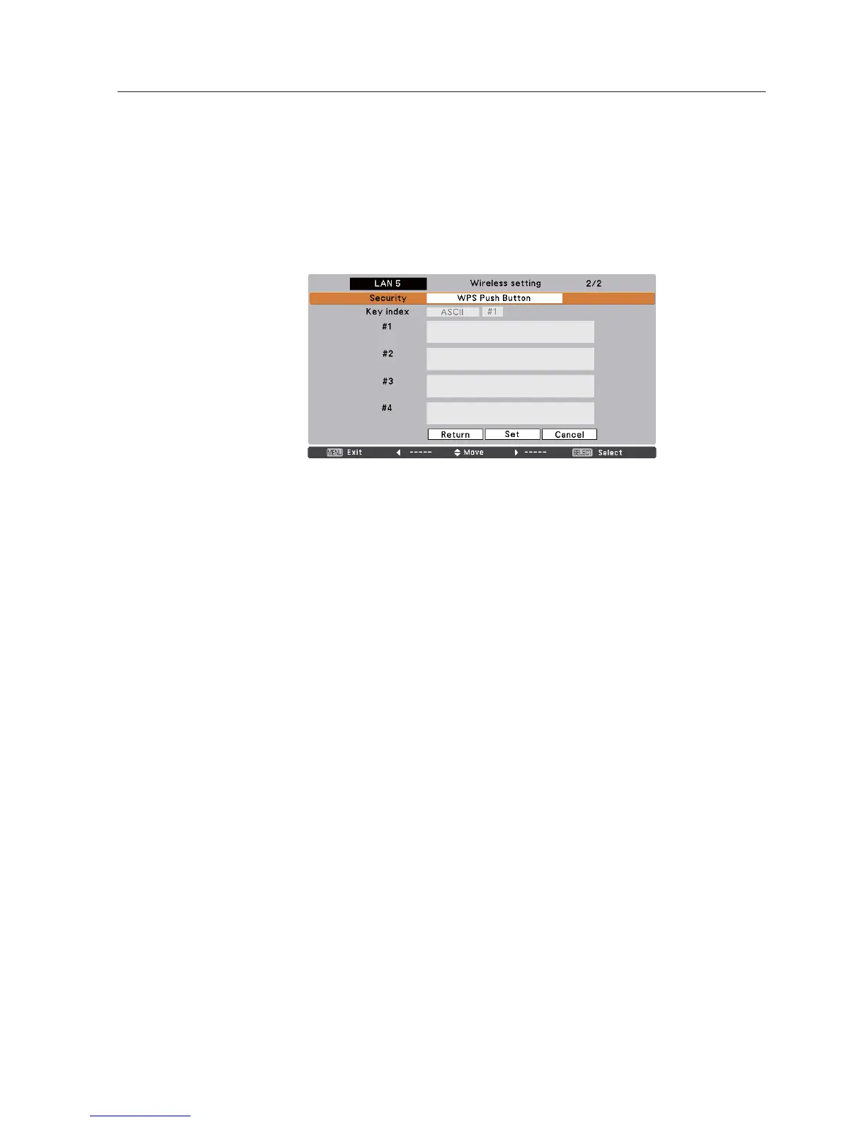 not succeeded, “Failed in WPS setting. Please reset” message will appear and “Security” items will