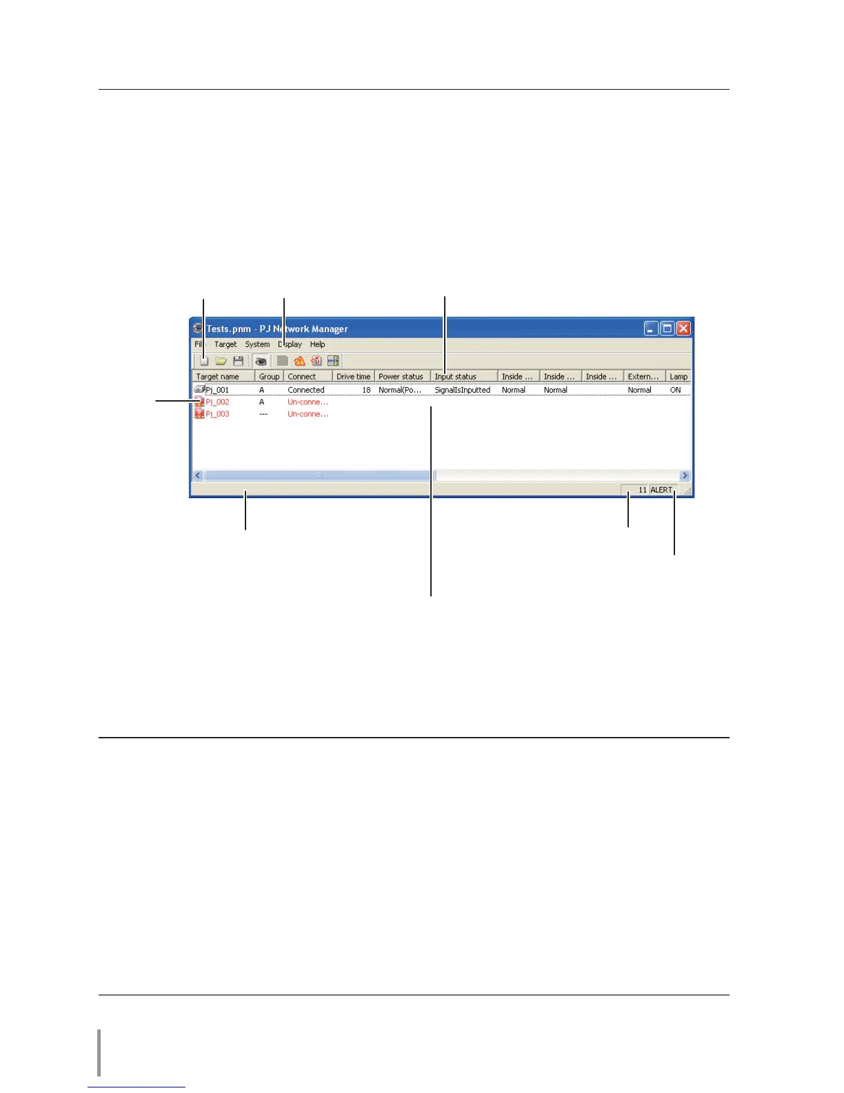 Status bar........................... Indicates the status of PJ Network Manager and explaining the command selected