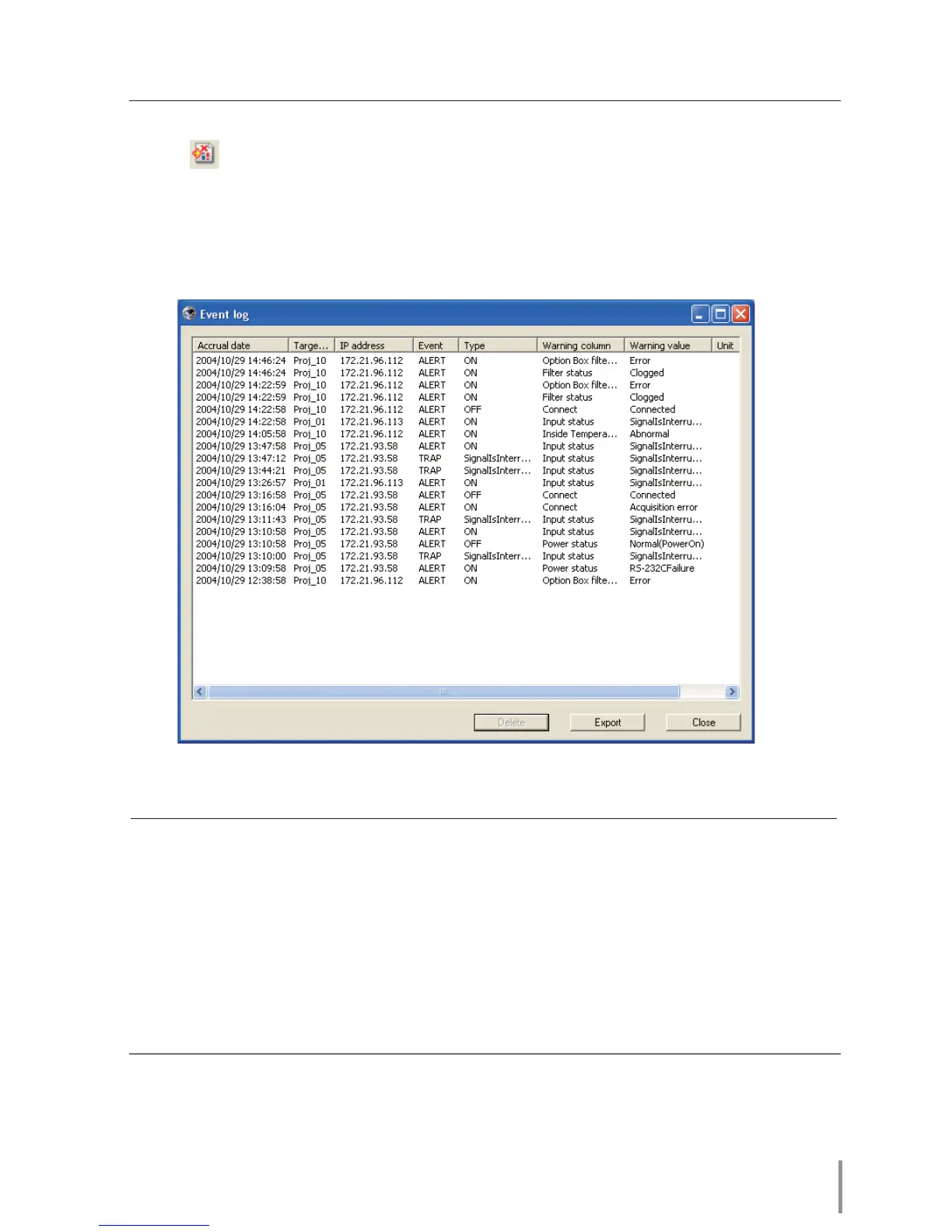 1 Click button on the tool bar. The event log display window appears and the events