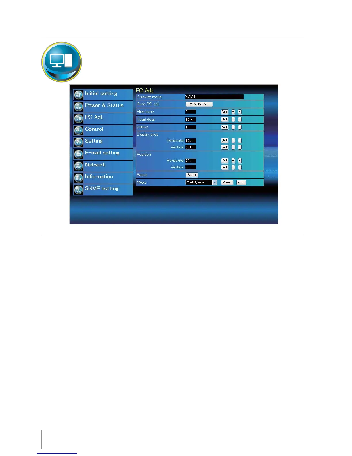 Mode Free............Clear the PC adjustment values. Select a mode no. [Mode1 - Mode5] from the pull-