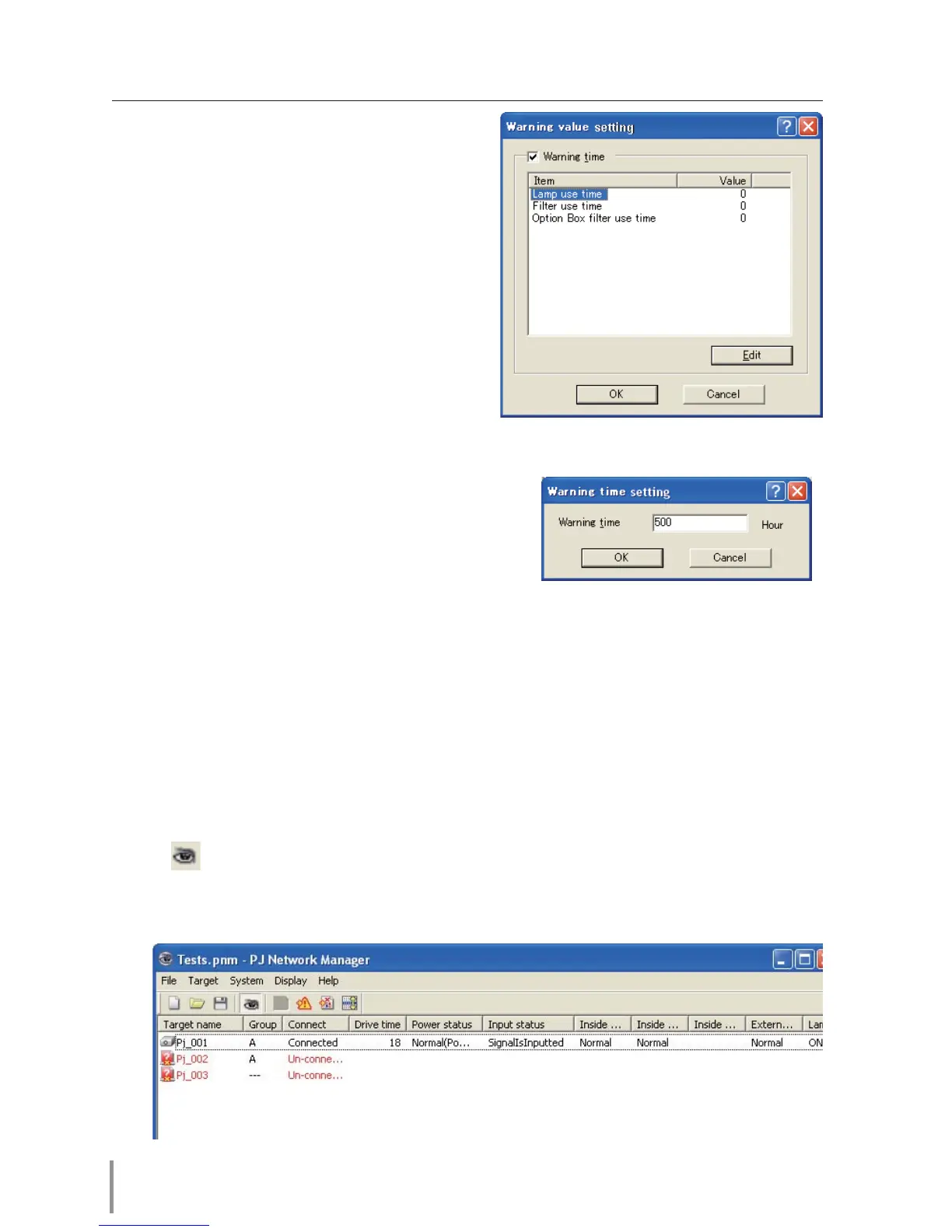 the current setting time. Up to 99,999 hours can be set for the use time. The warning value is stored