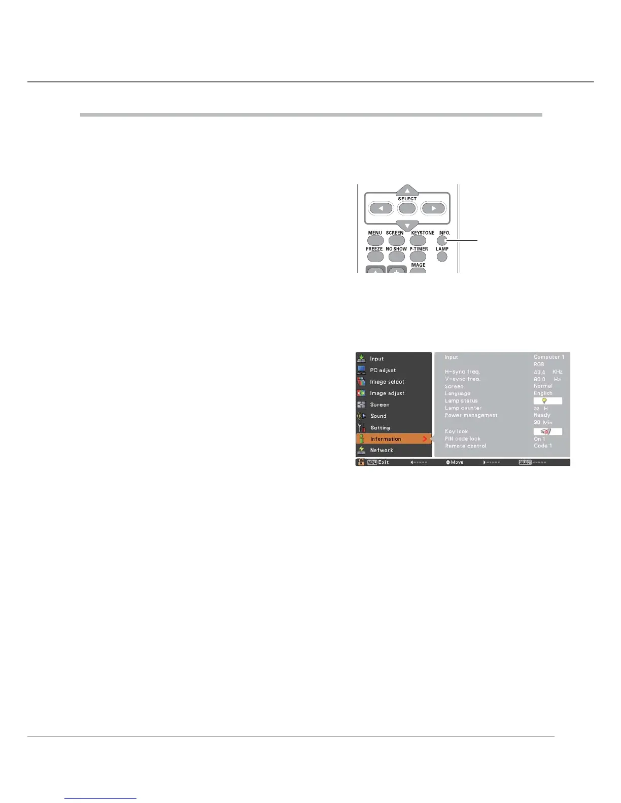 The Information Menu is used for checking the status of the image signal being projected and the operation of the projector.