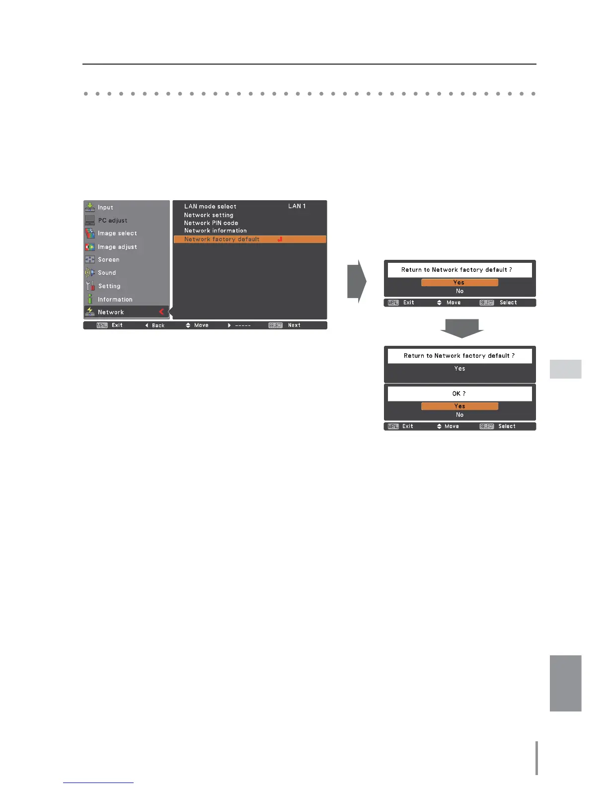 1. Select “Network factory default” in the Network menu and press SELECT button.