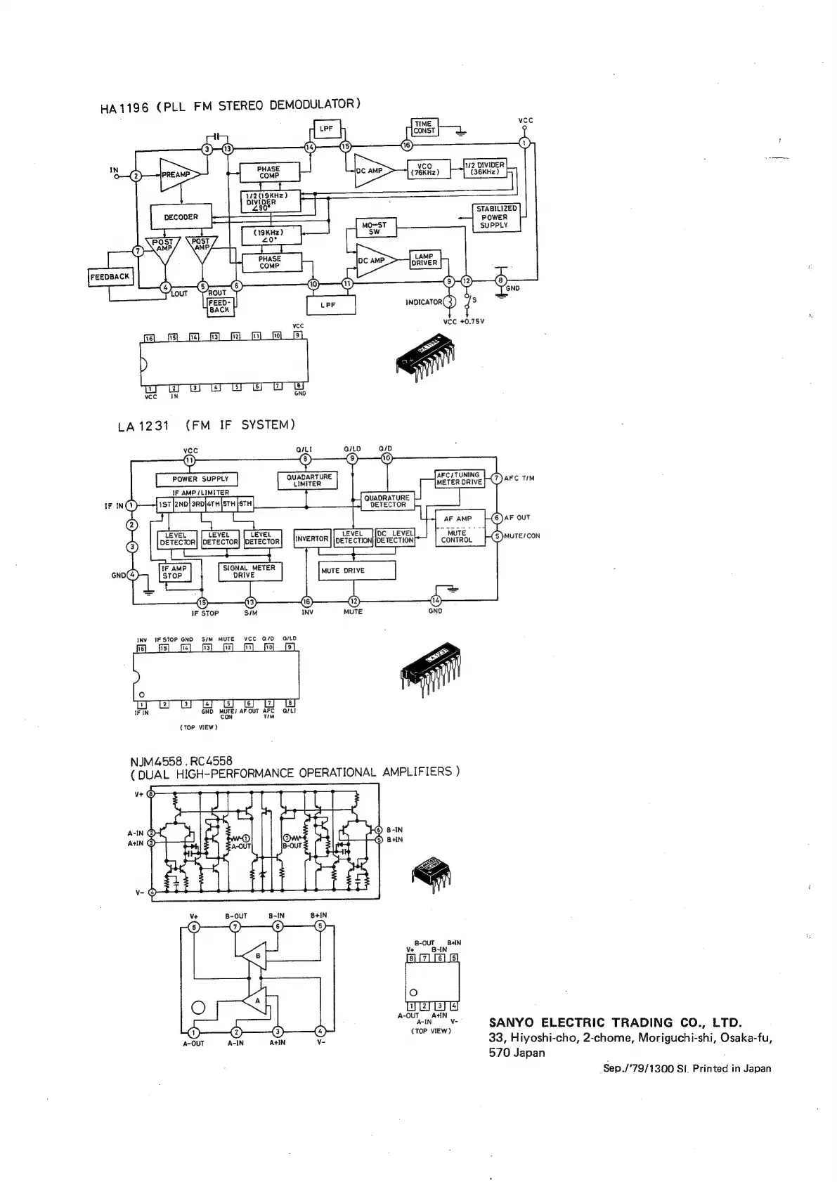 Sanyo PLUS T35 - Integrated Circuit Function Diagrams (Continued); HA 1196 FM Stereo Demodulator IC Diagram; LA 1231 FM IF System IC Diagram; NJM4558 Operational Amplifier IC Diagram