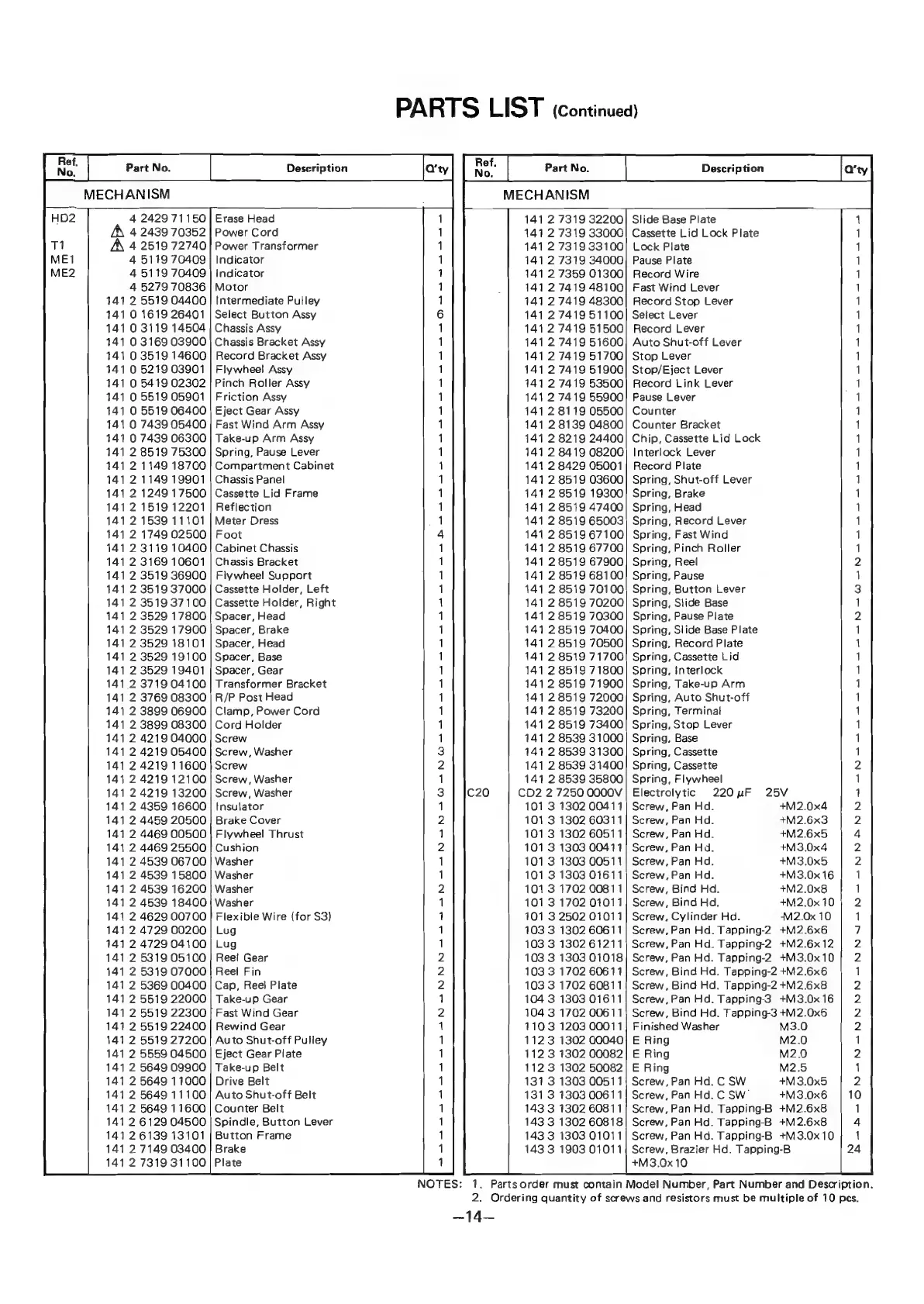 Sanyo RD 30 - Mechanism Components List; Mechanism Part Numbers; Screws, Washers, and Notes