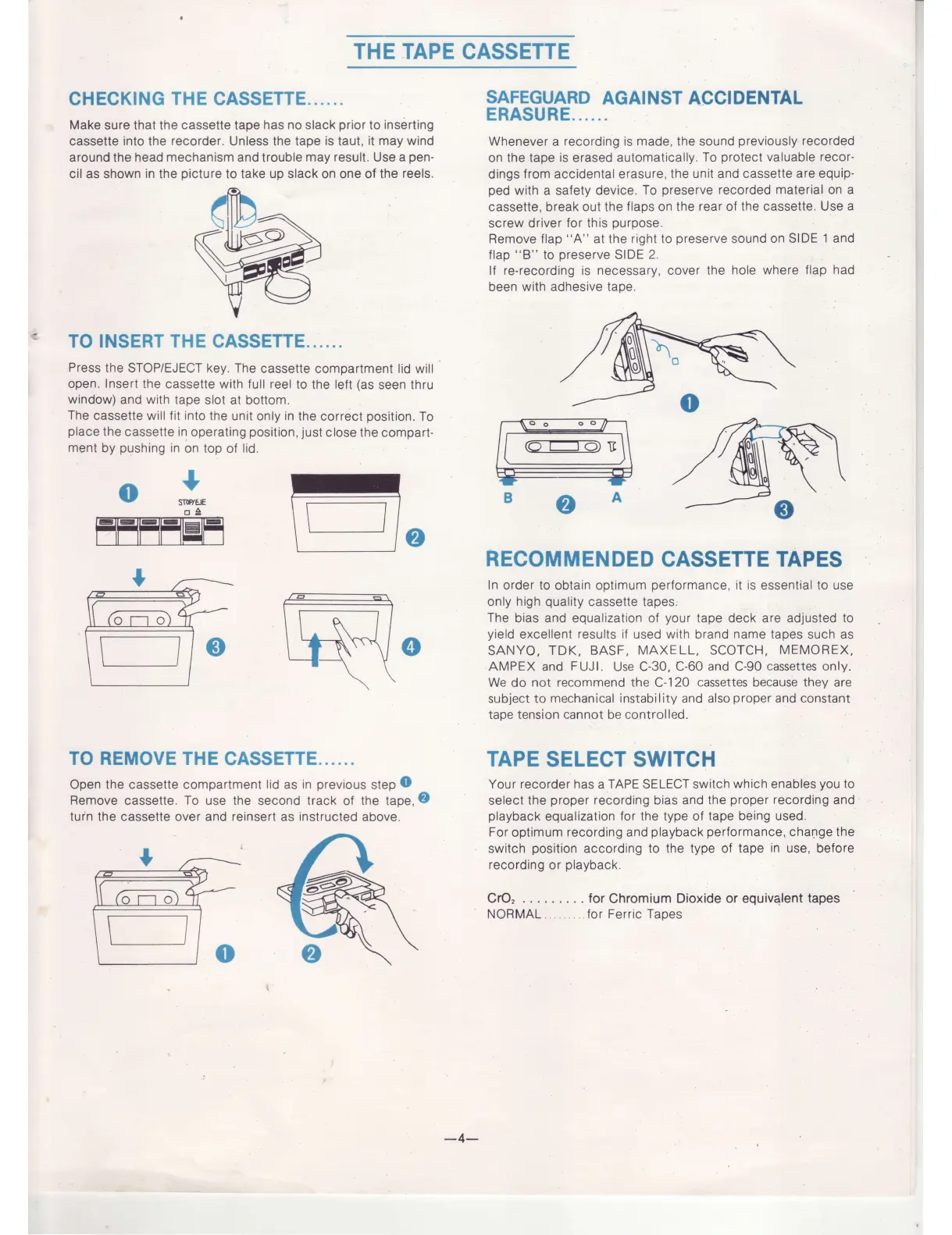 Sanyo RD 8 - Cassette Tape Management; Cassette Preparation and Insertion; Protecting Tapes from Erasure; Tape Selection and Usage Notes