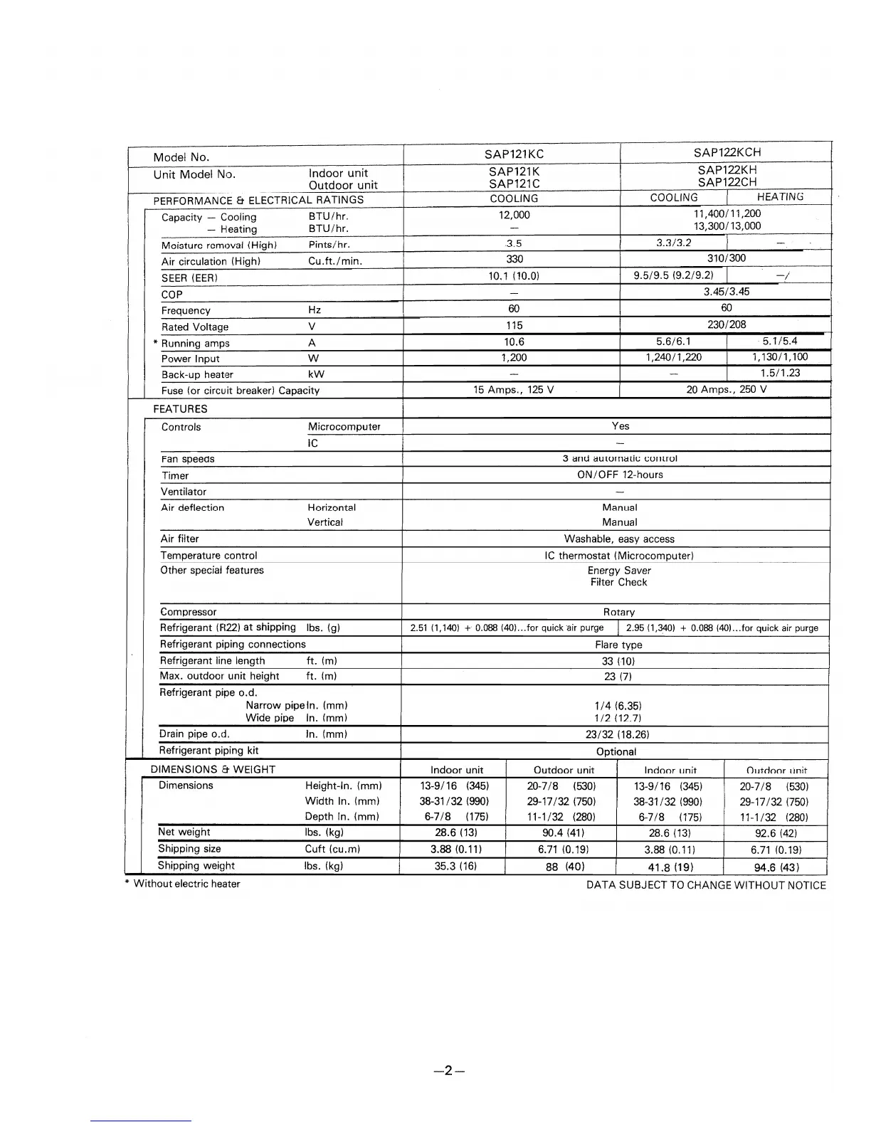 Sanyo SAP182KCH - Performance & Electrical Ratings; Features; Dimensions & Weight