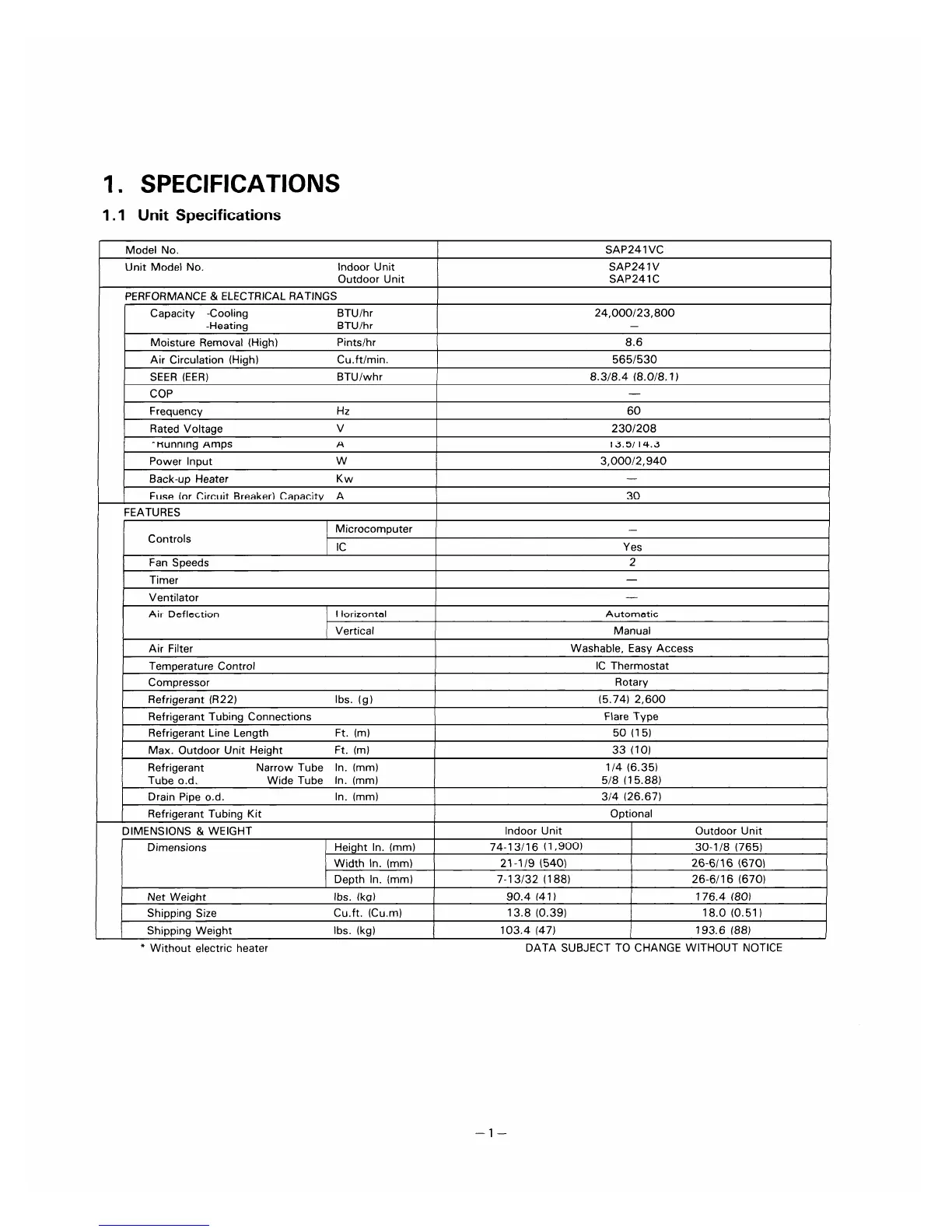 Sanyo SAP241 - Unit Specifications