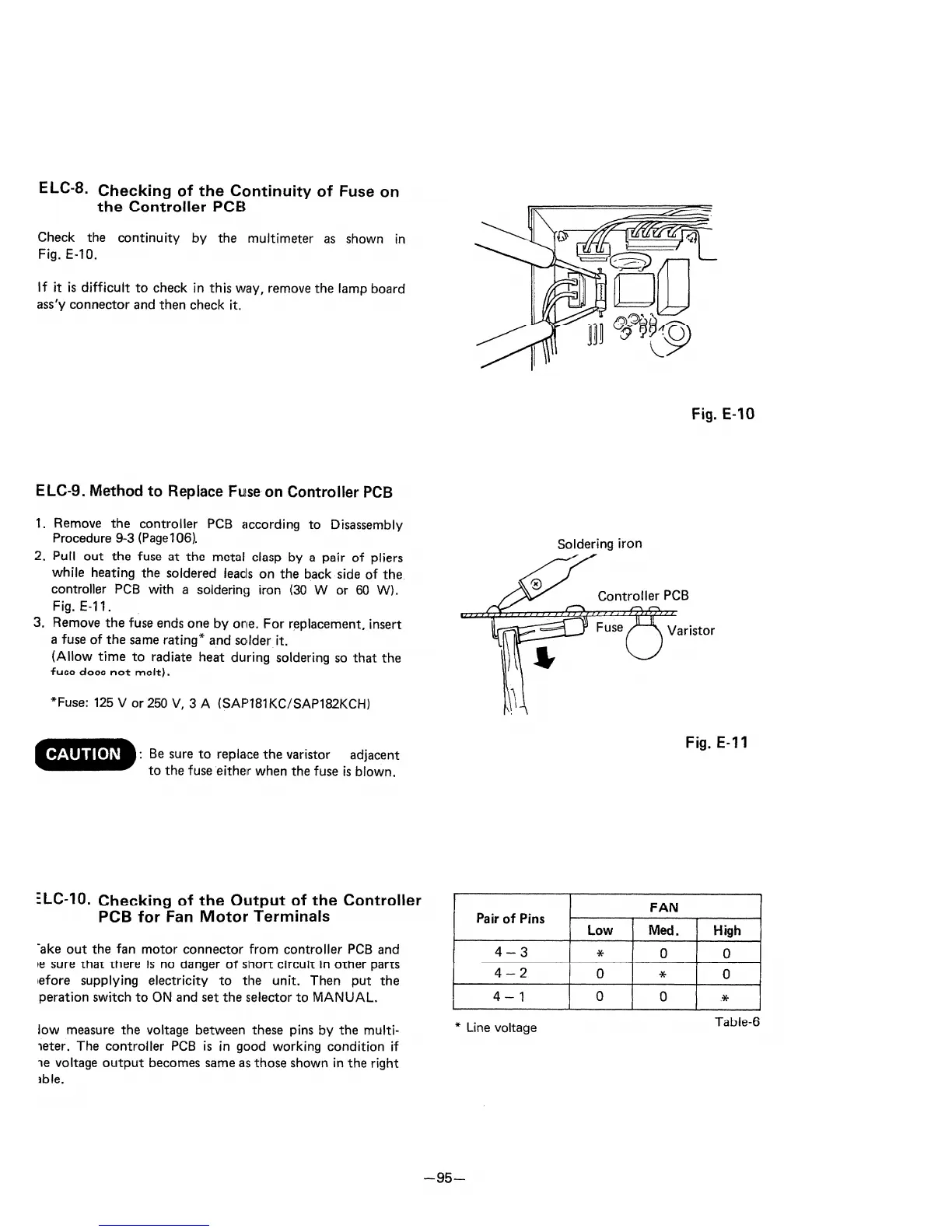 Sanyo SAP91KC - Checking of the Continuity of Fuse on the Controller PCB; Method to Replace Fuse on Controller PCB; Checking of the Output of the Controller PCB for Fan Motor Terminals