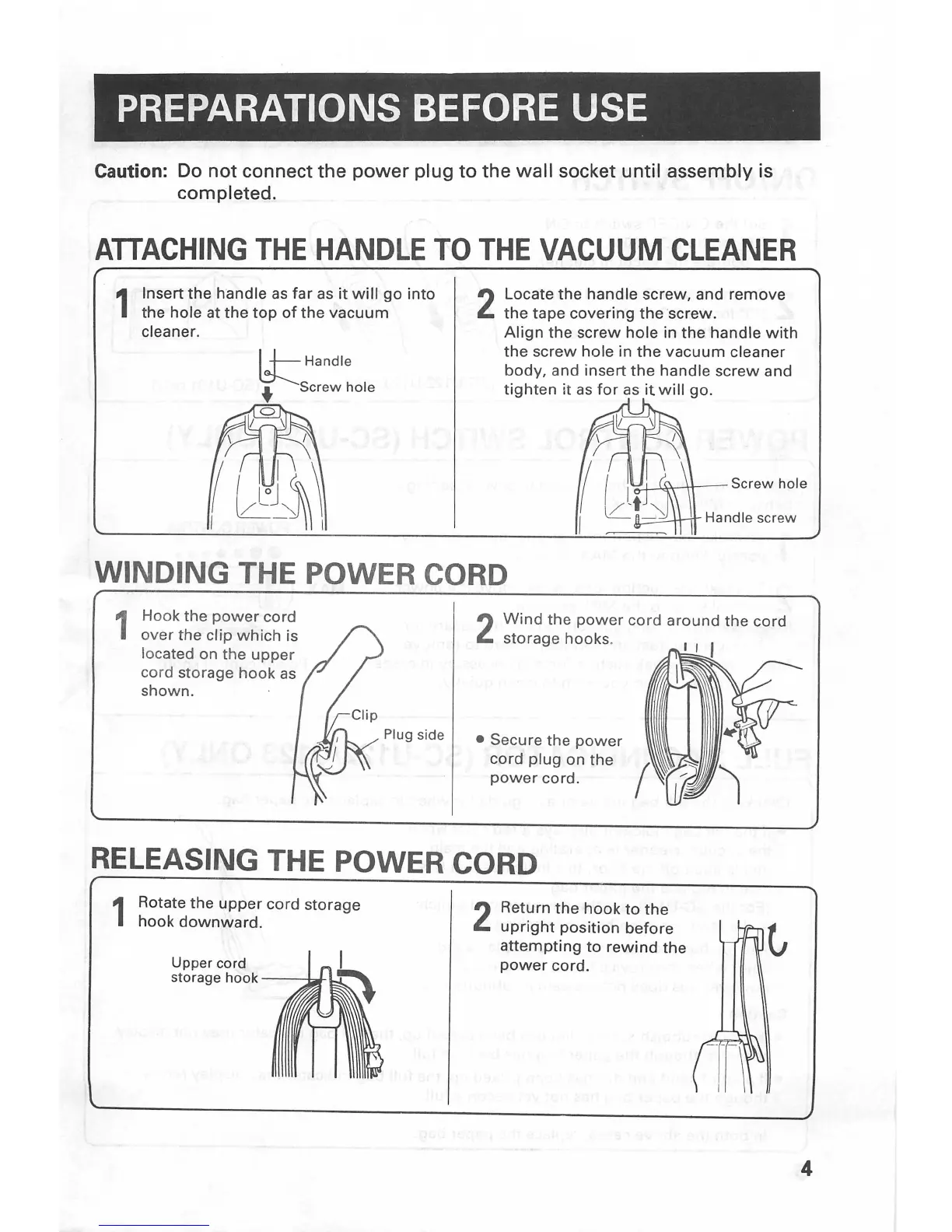 Sanyo SC-U123 - Preparations Before Use; Attaching the Handle; Winding the Power Cord; Releasing the Power Cord