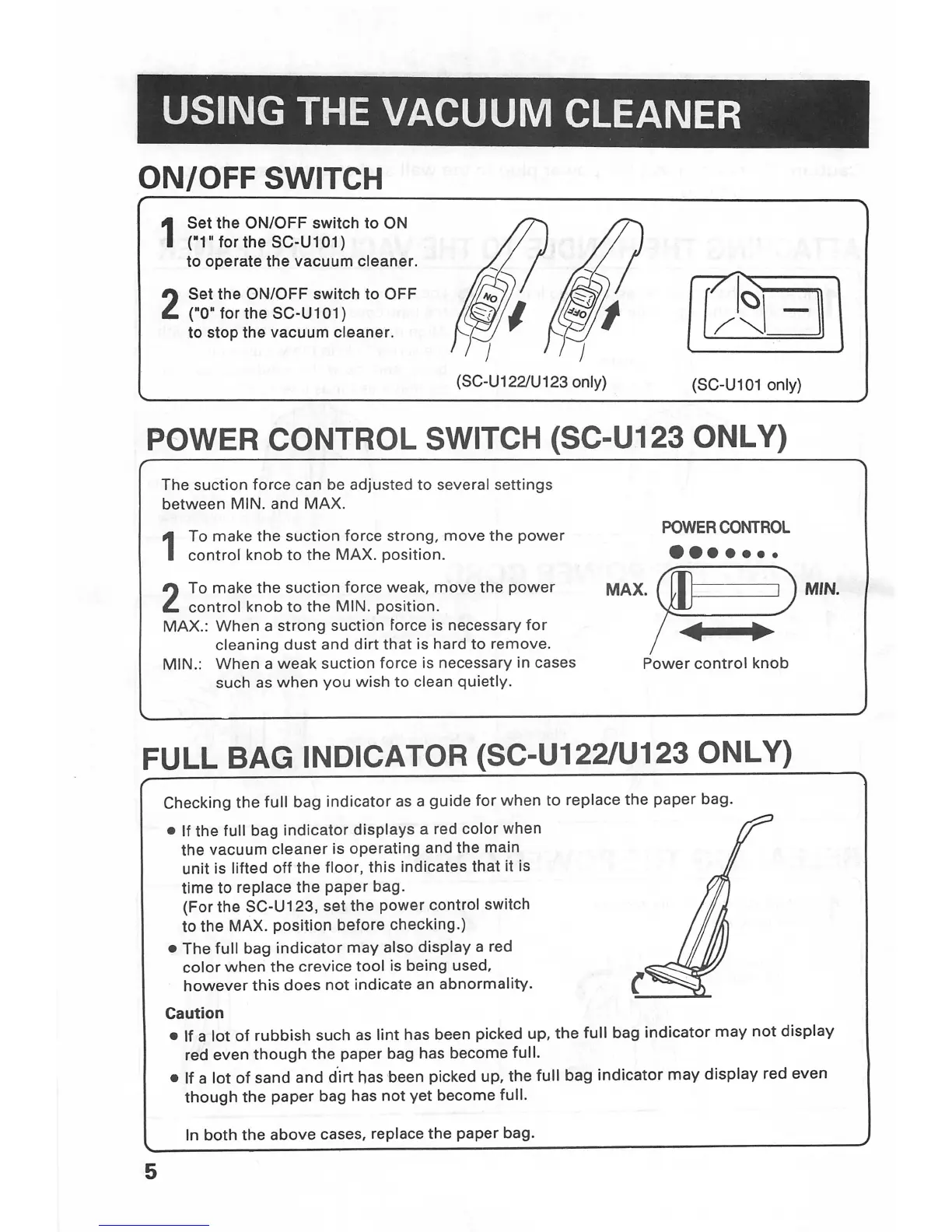 Sanyo SC-U123 - Using the Vacuum Cleaner; On;Off Switch Operation; Power Control Switch (SC-U123); Full Bag Indicator (SC-U122;U123)