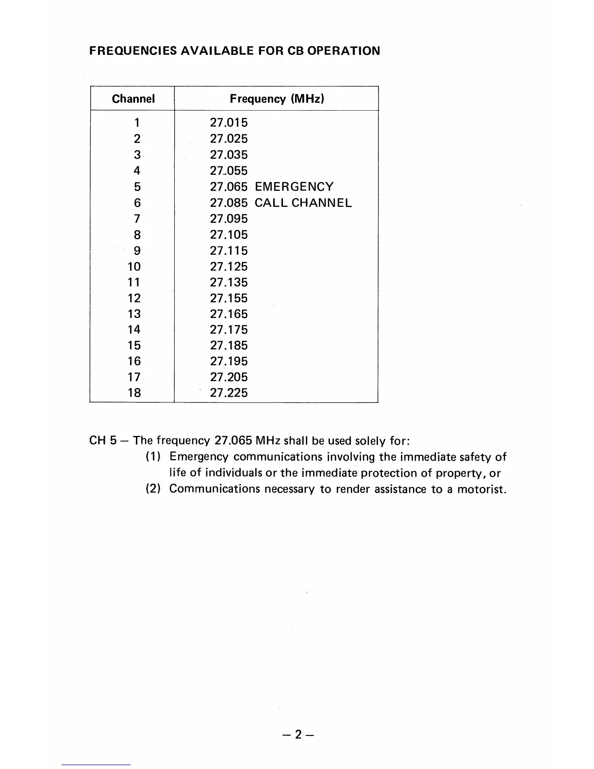 CH 5 — The frequency 27.065 MHz shall be used solely for: