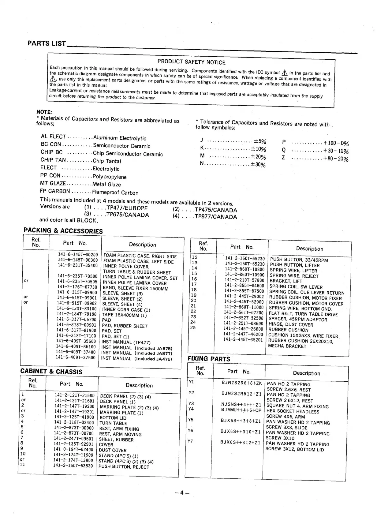 Sanyo TP 477 - Parts List and Component Identification; Packing and Accessories Parts; Cabinet and Chassis Parts