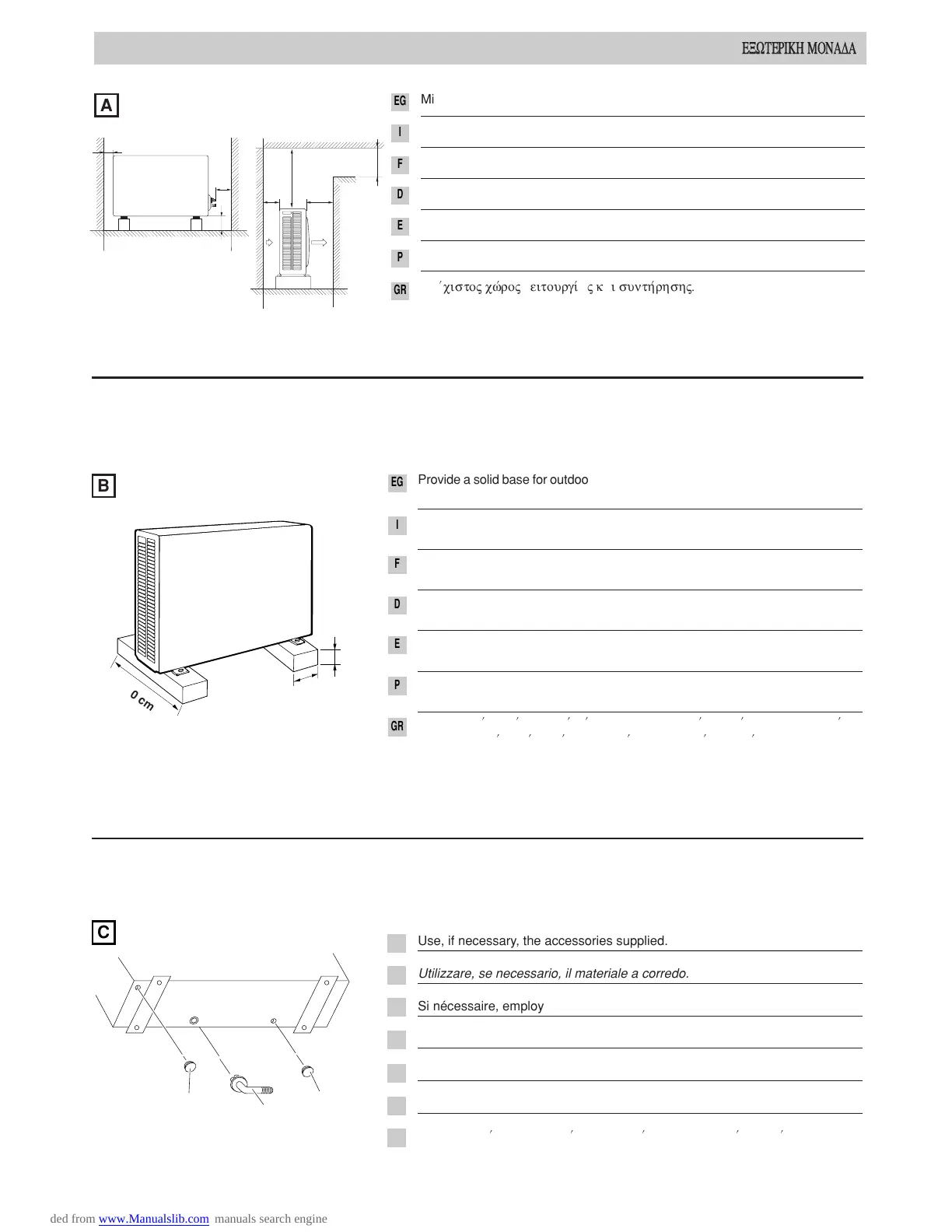 Predisporre l'unità esterna su base solida rialzata dal terreno e fissarla con 4