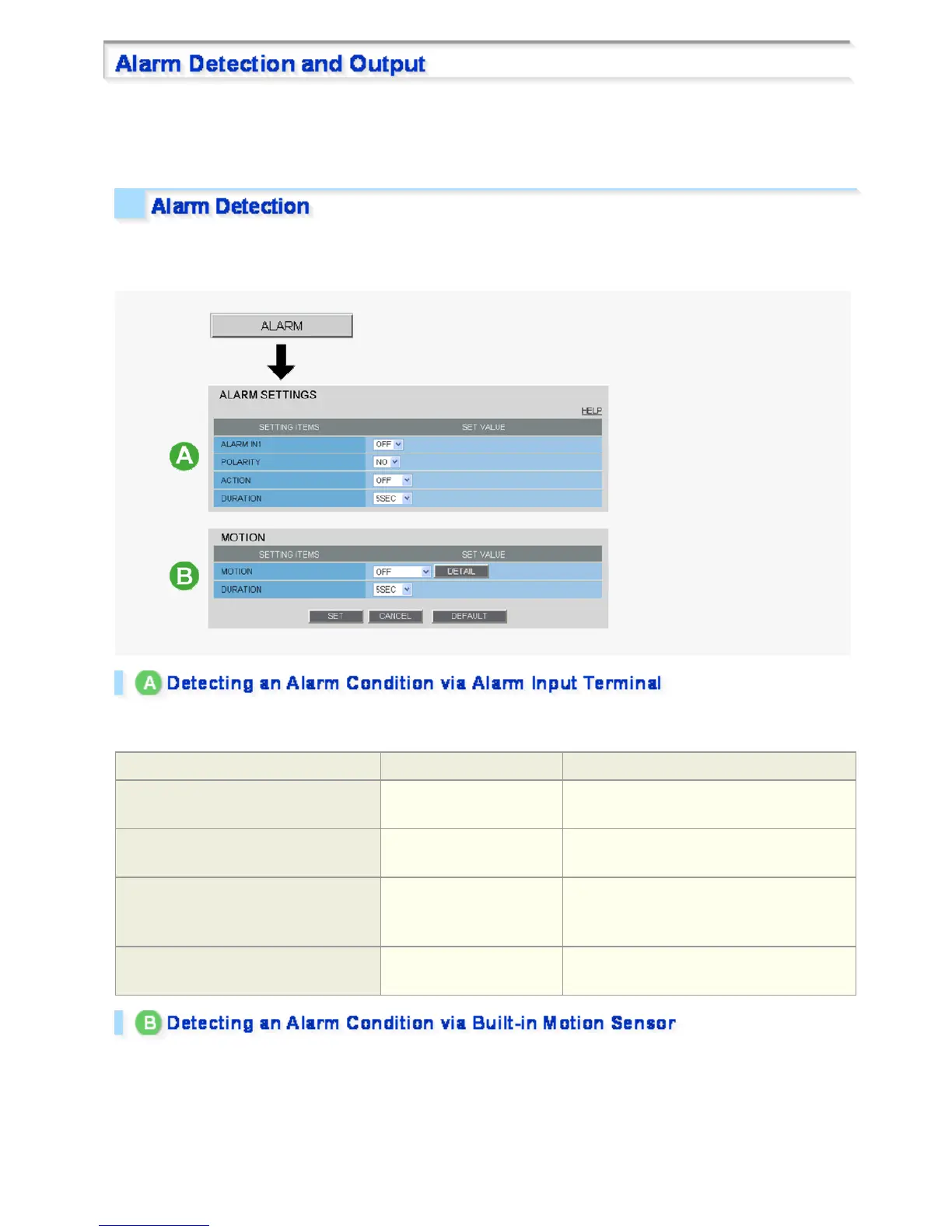 You can configure the camera to detect alarm conditions via the “alarm input terminals” or “built-in motion sensor”.