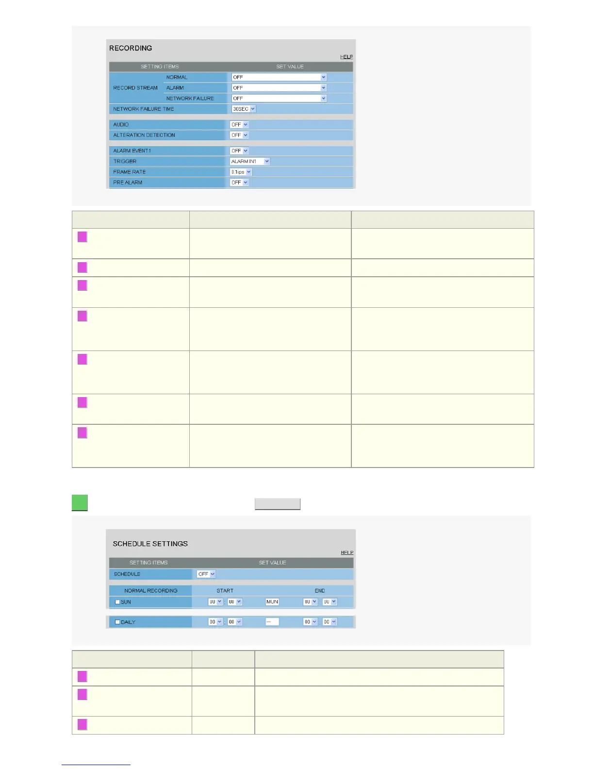 1 SCHEDULE OFF ON (Enables recording schedule configuration.)