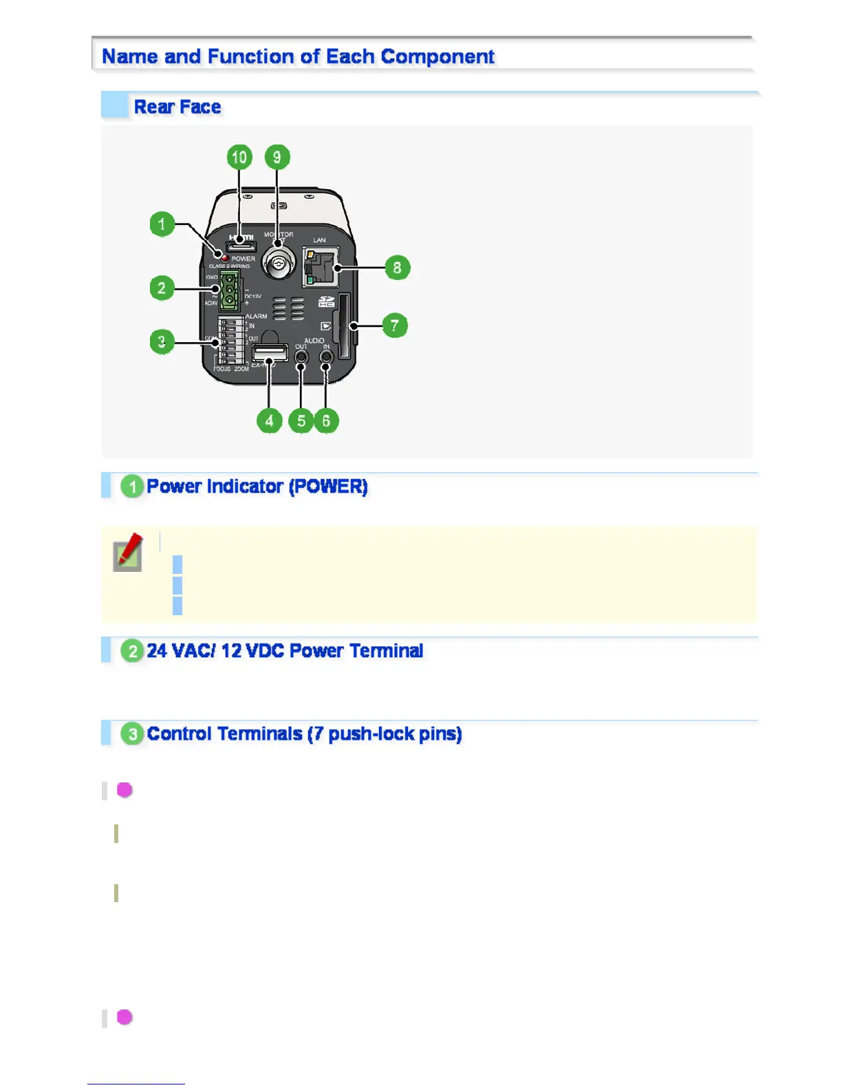 Connecting an external switch, infrared sensor, or other device to these terminals enables the camera to