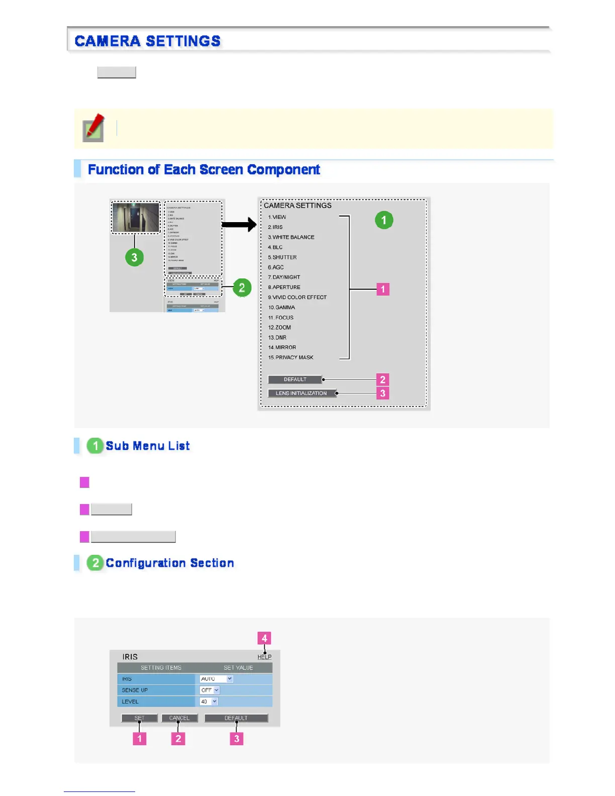 Click CAMERA button in the configuration menu to display the CAMERA SETTINGS screen.