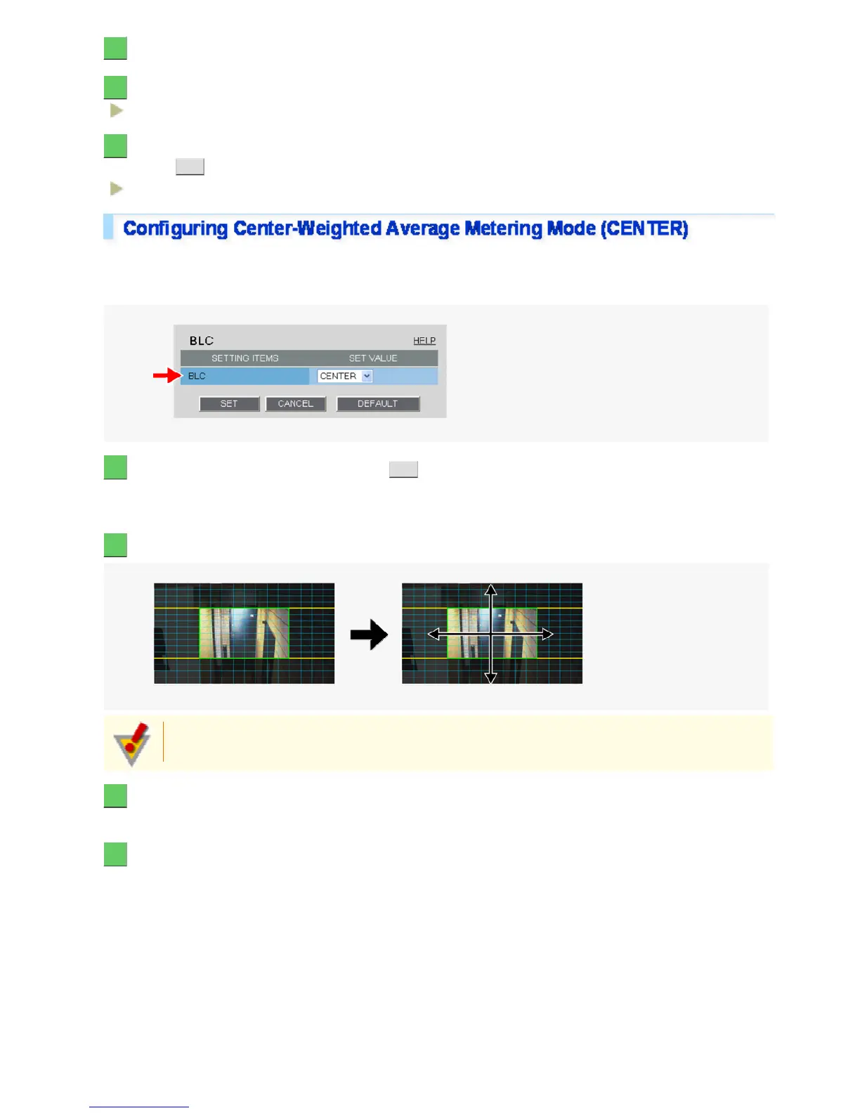 The BLC center/window weighting setting screen appears, showing a rectangle representing the center metering
