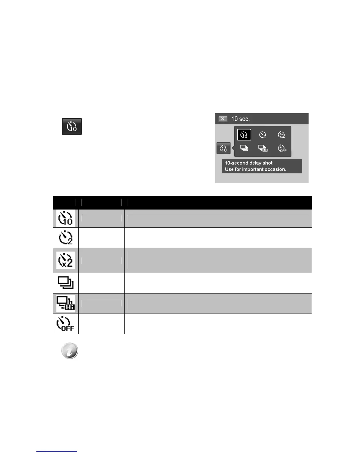 10 Sec. Sets a 10-second delay to capture image after pressing the shutter button.