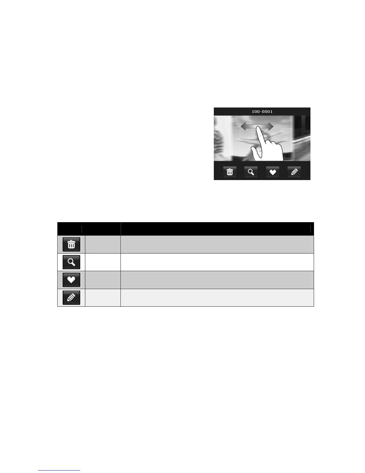 The table below shows the function of onscreen application buttons in photo stream mode.