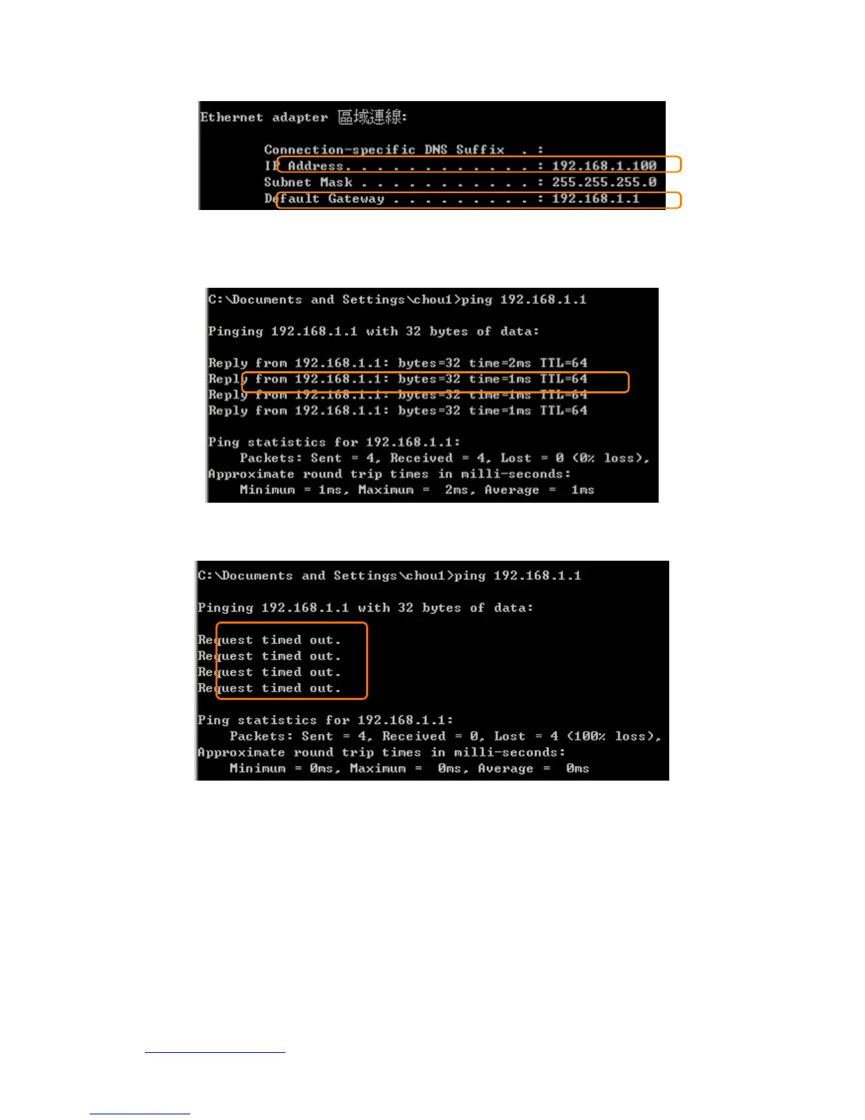 Step 4. Ping a legal WAN Address such as 192.168.1.1. If Internet works, it will show