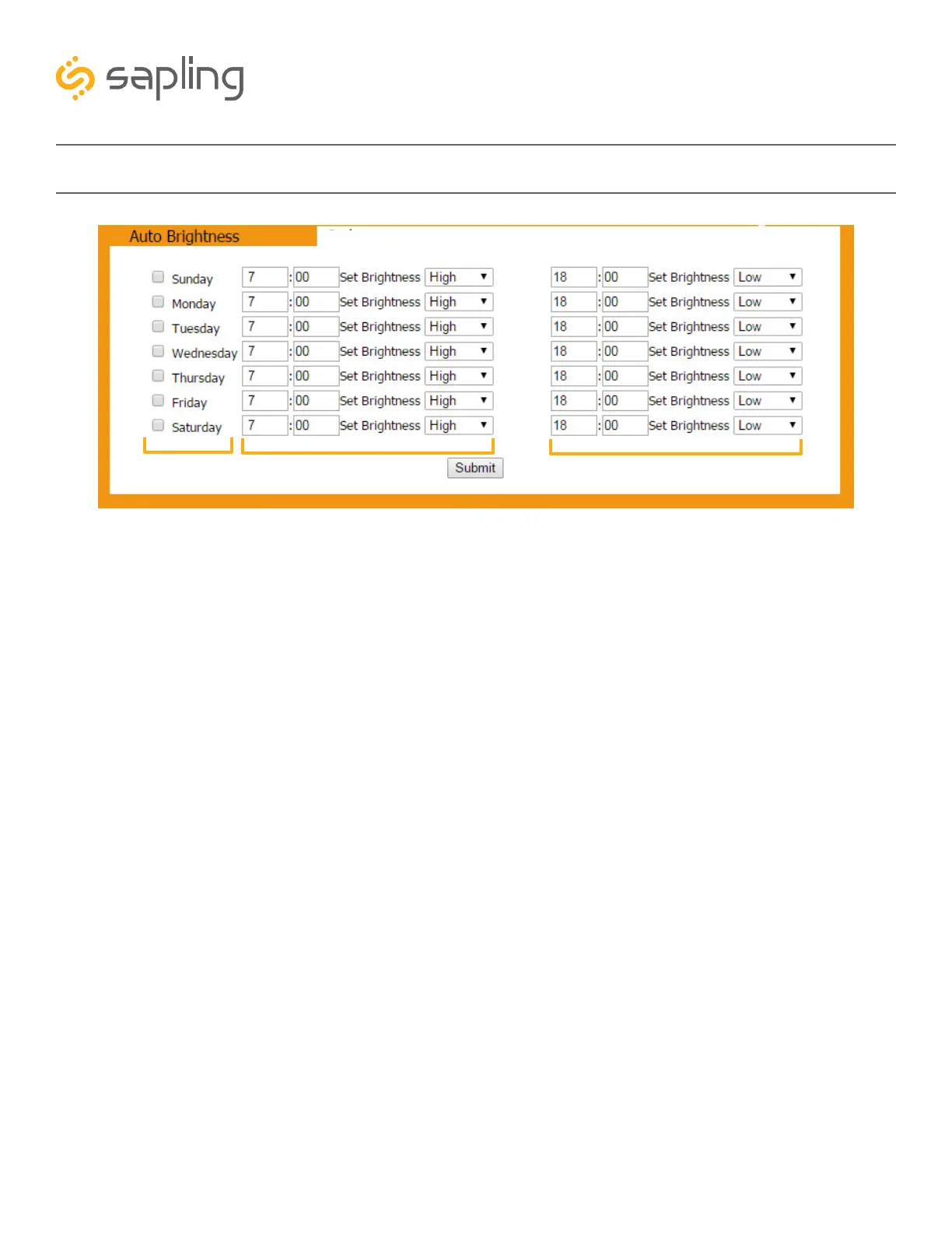new brightness level will take effect. Times are entered in 24 hour mode. Brightness options are High,