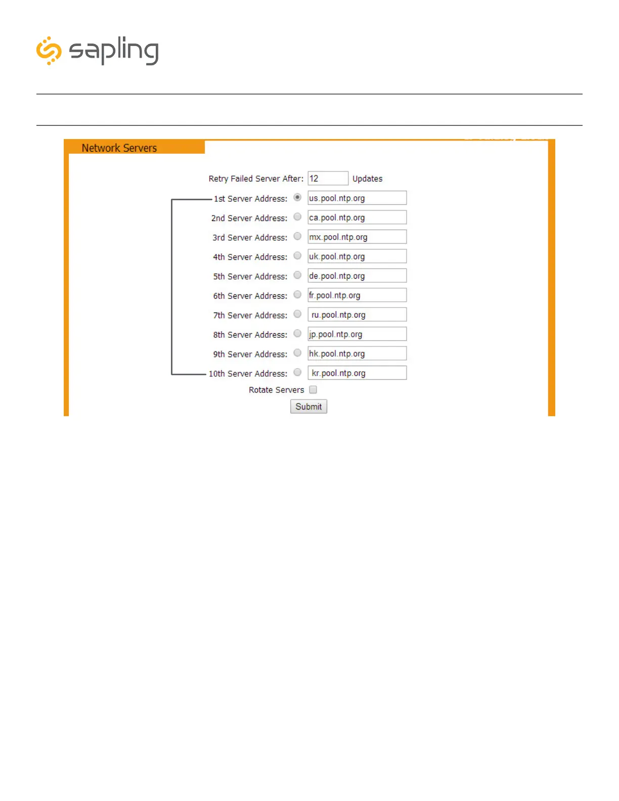 2. Server Addresses - These fields allow a user to set the address that the clock will use to obtain NTP
