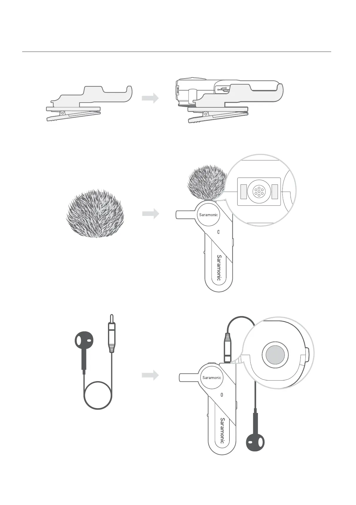 Saramonic BTW - Accessory Setup Guide; Attaching Belt Clip; Attaching Fur Windshield; Connecting Monitoring Earbud