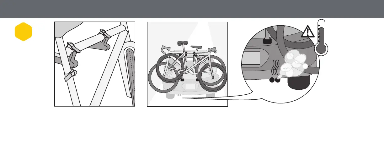 Cierre las correas y tire con fuerza. Las bicicletas más pesadas deben colocarse más cerca del vehículo. Nota: tenga en cuenta la posición de la llanta de la bicicleta