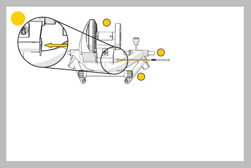 Włożyć śrubę (d) w okrągły otwór w ramie trenażera (a), zgodnie ze wskazaniem strzałki. Przełożyć przez jednostkę