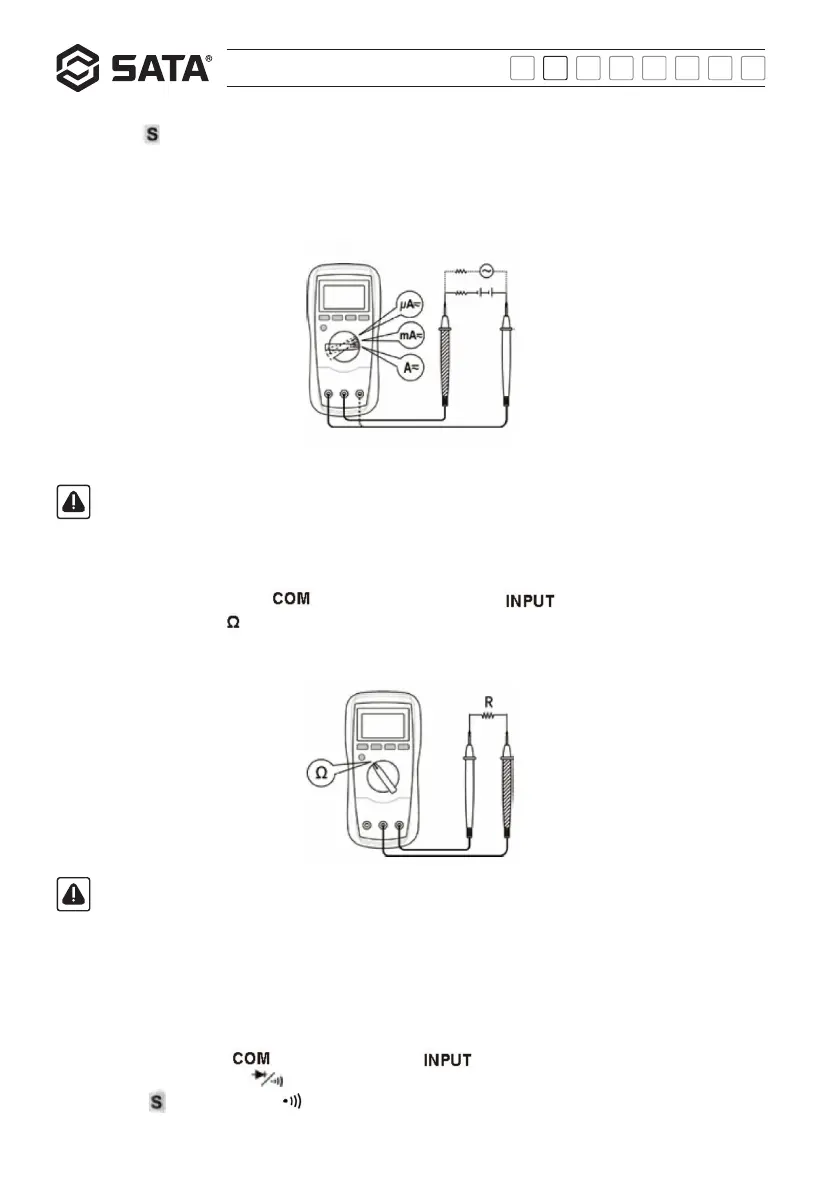 3) Press the " " button to select the AC current or DC current measurement function and the corresponding symbol will appear