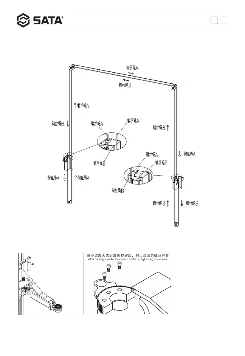 保证左右两边滑台在第一档保险处,将平衡钢丝绳按图示轨迹安装好。先不要拧紧螺母,等调试同