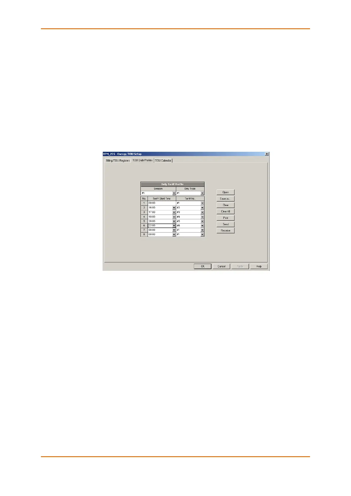 To configure your daily tariff schedule, select Energy/TOU from the Meter Setup menu, and then click on