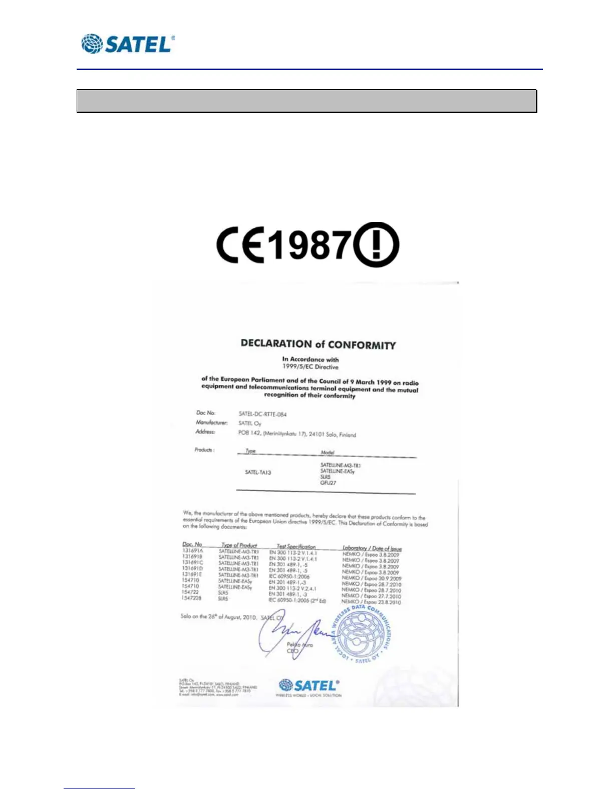 Hereby, SATEL Oy declares that GFU27 radio modem is in compliance with the essential