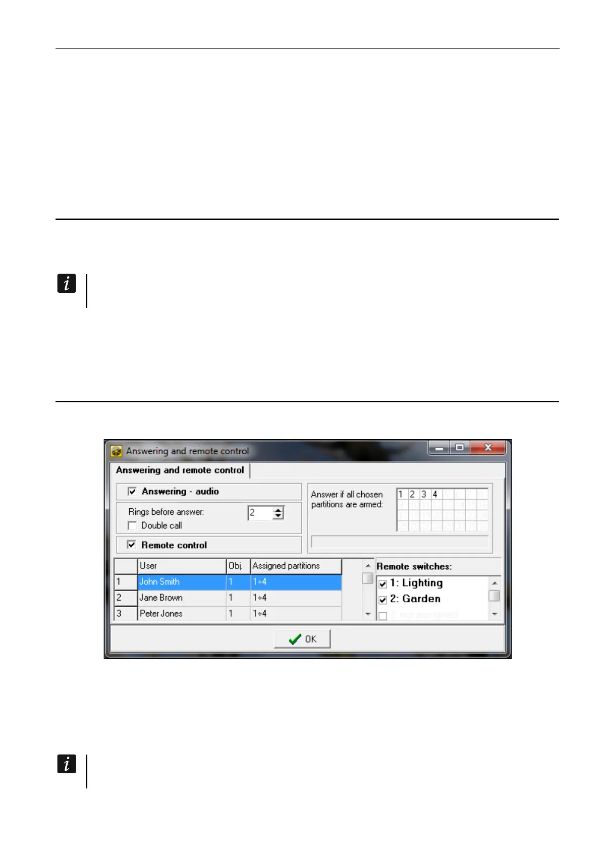 The call answering function allows the control panel users to receive information on