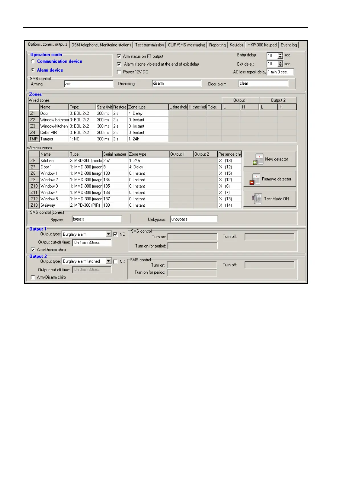 Fig. 9. „Options, zones, outputs” tab, when alarm device mode has been selected.