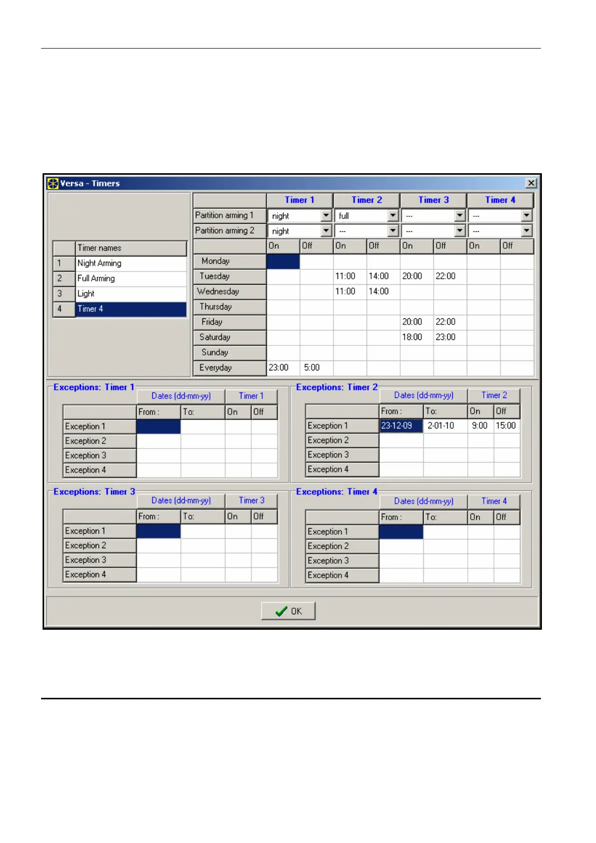 – 4 exceptions, i.e. the time periods when the timer will be activated/deactivated at