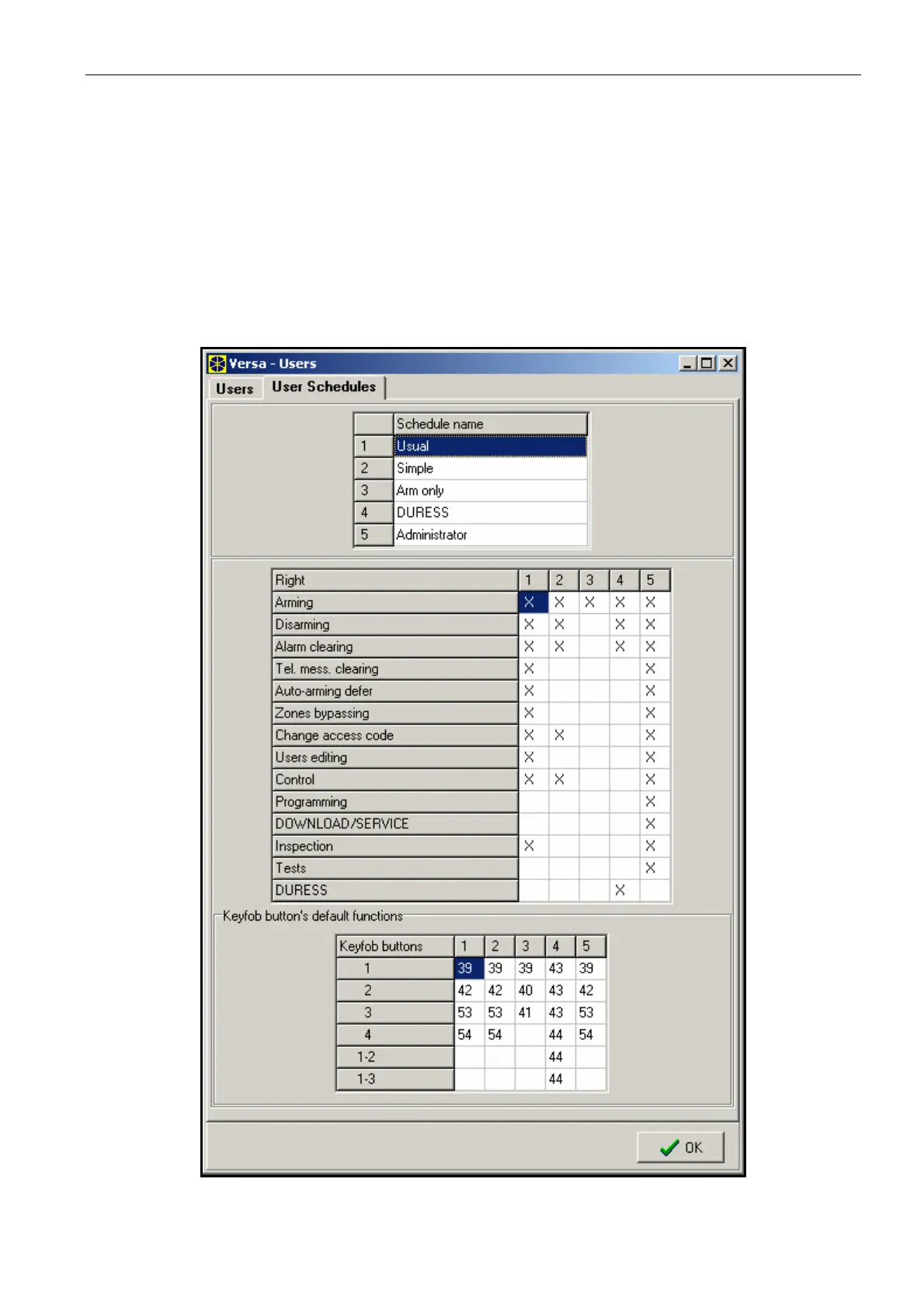 Fig. 19. Programming user schedules in the "Versa – Users" window, DLOADX program