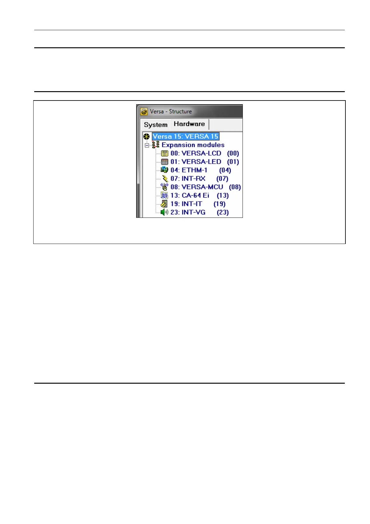 DLOADX program: “VERSA – Structure” window “Hardware” tab. The list of devices is