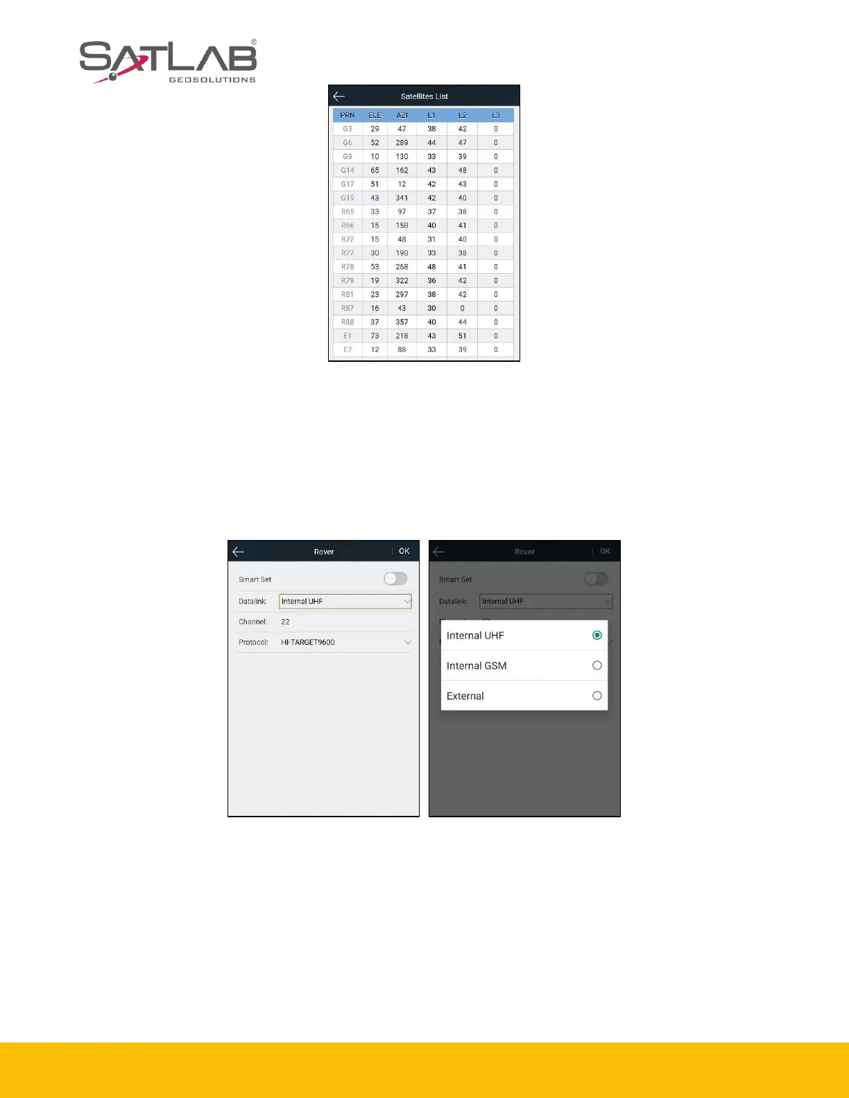Set up the rover’s data link and parameters. The rover station data link includes:Internal UHF,