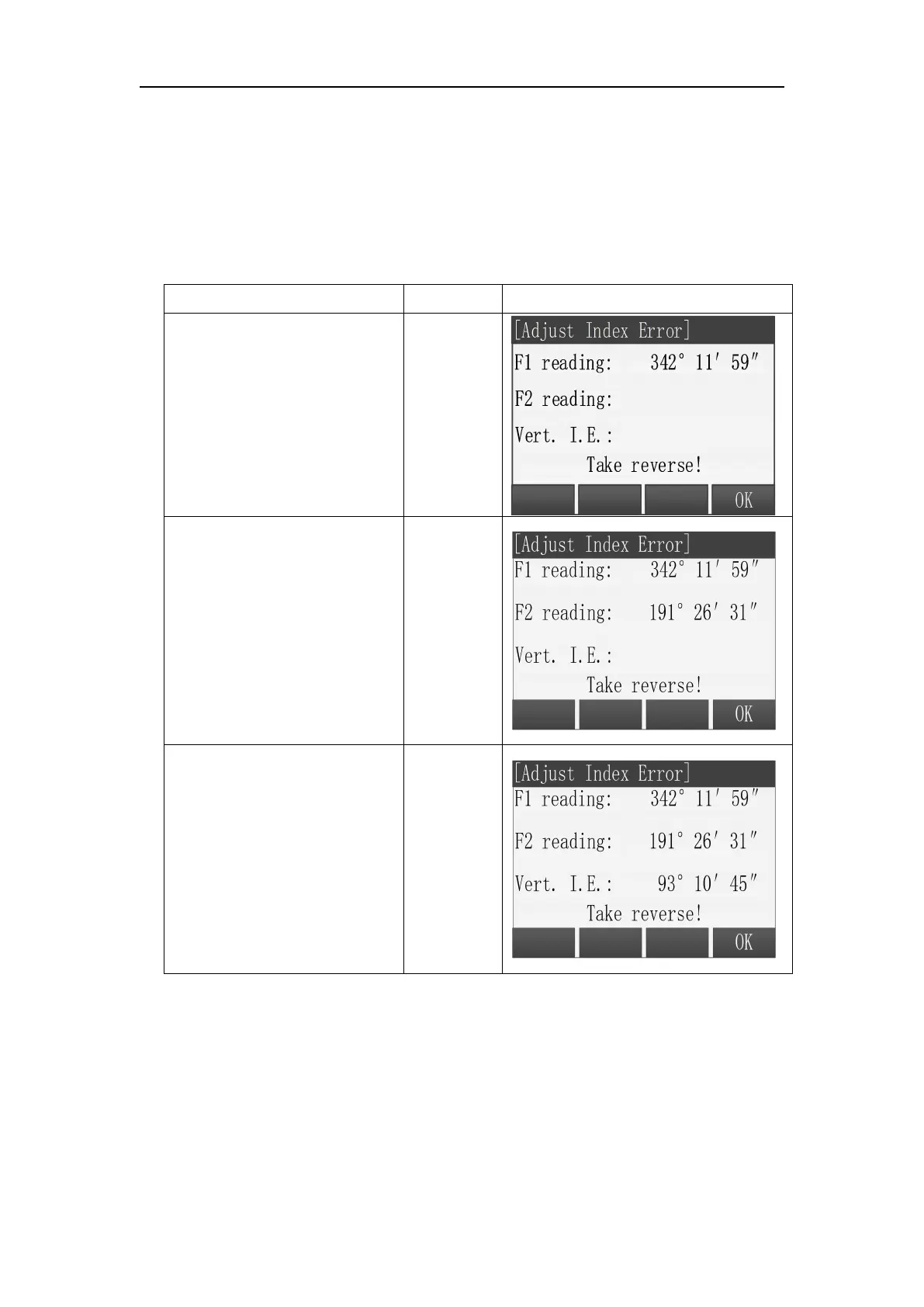 In Tools Menu, choose “1 Adjust”, then press [F2] to enter “Adjust Index Error”.